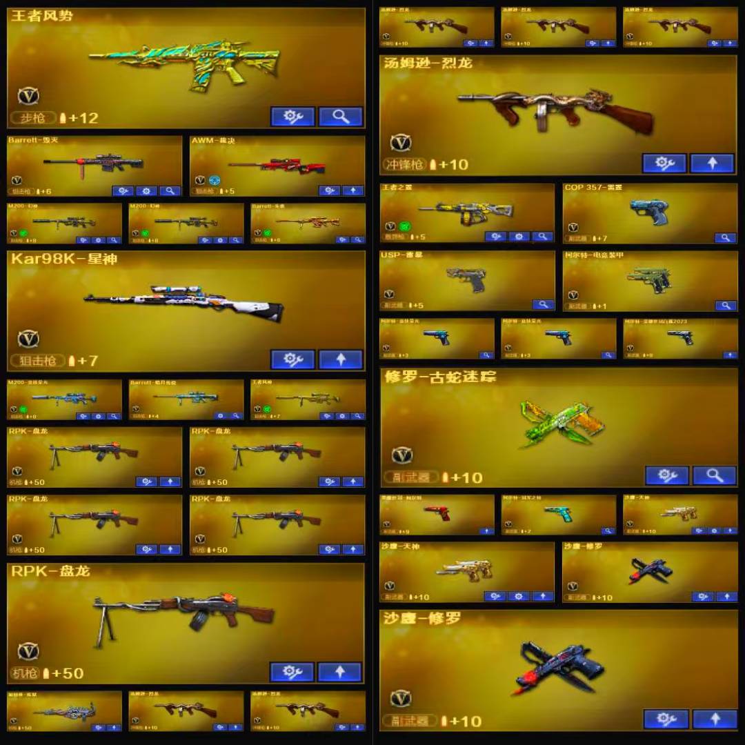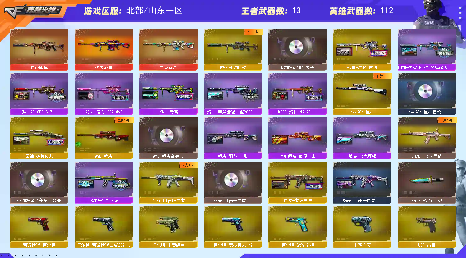 该账号已经过虚拟财产认定,若使用科技和鼠标宏等特殊外设导致账号出现问题,必追究法律责任!祝老板玩的愉快;USP-雷暴,荣耀世冠-柯尔特,柯尔特-荣耀世冠白鲨2023,柯尔特-冠军之特,炽芒蝶刃,Knife-冠军之刃,电竞教官-云悠悠,
