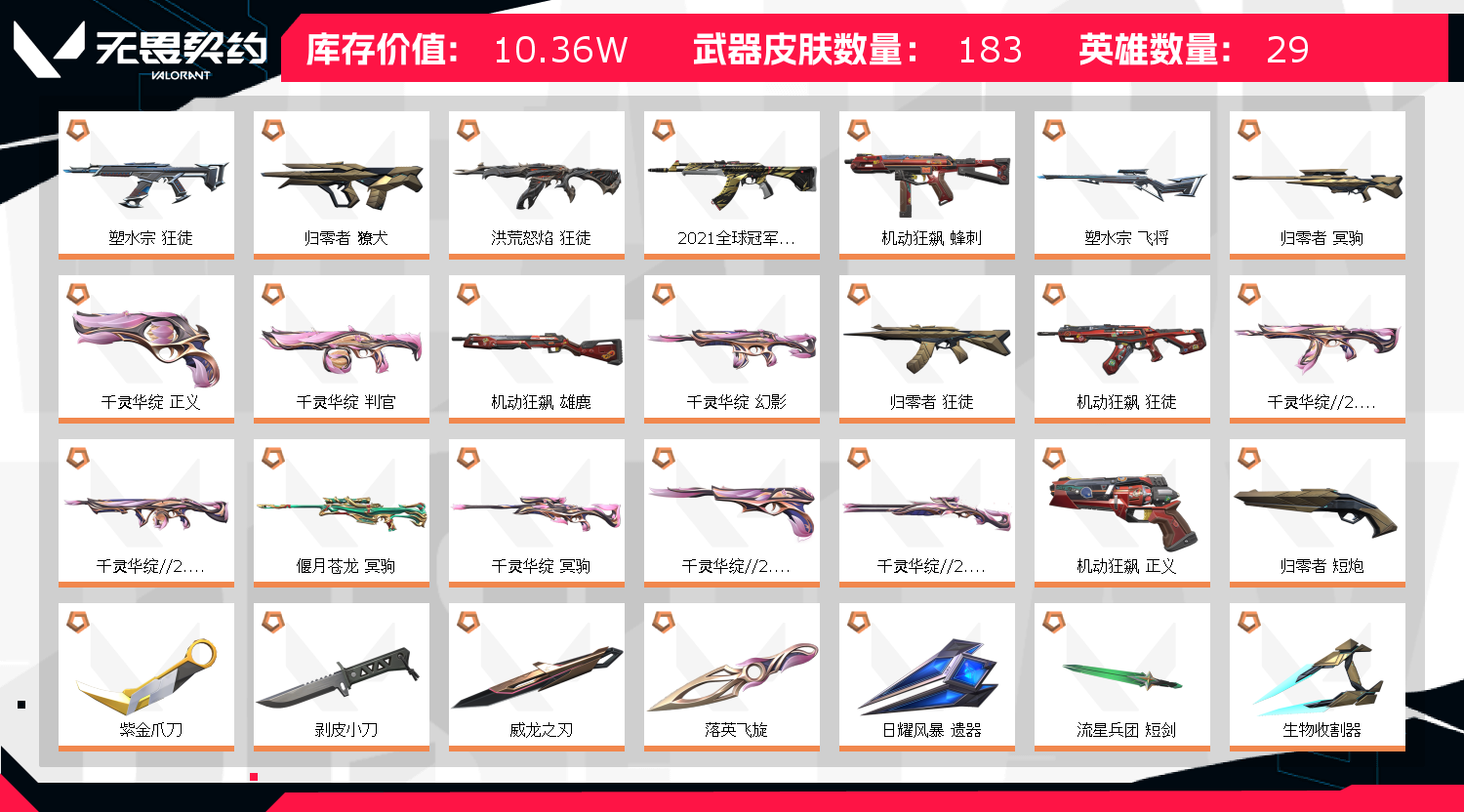 首页 > 租号大厅 > 无畏契约-wegame > wegame/wegame > 极品禁炸特效全开:VCT篆刀❤️21冠军套❤️颗秒套❤️莲花套❤️威龙归零摩托套+13狂徒+3幻影
