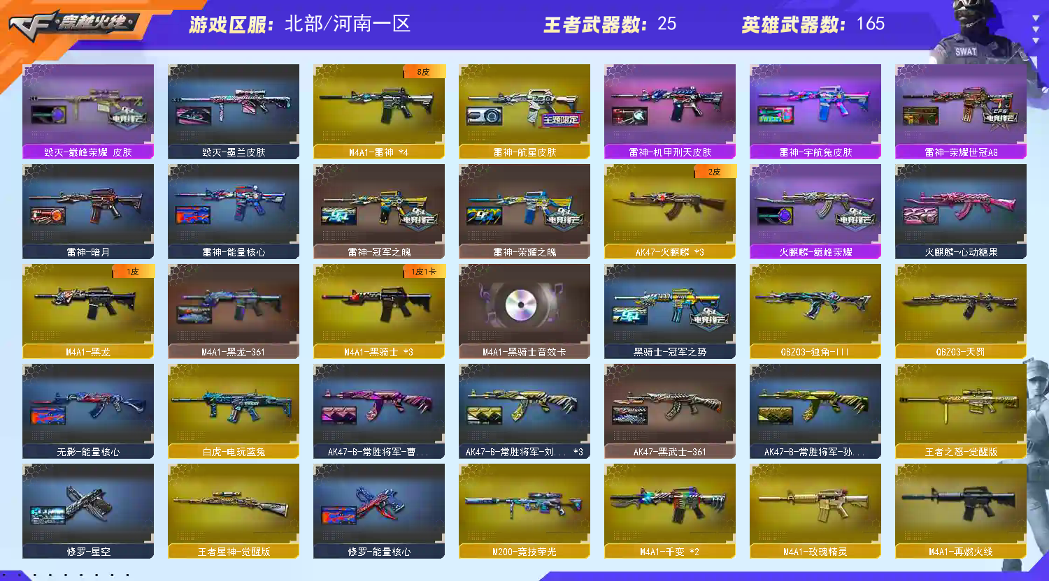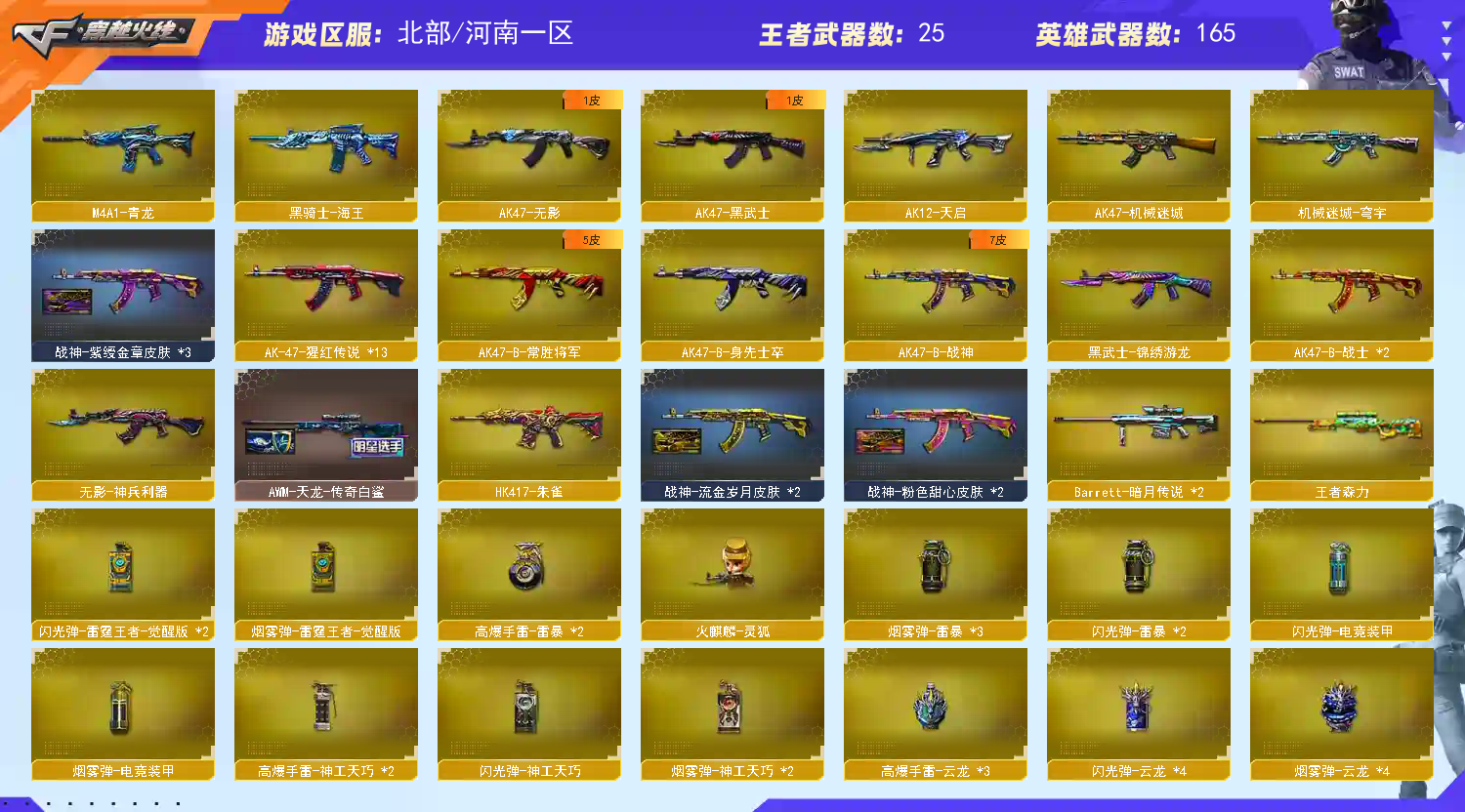 编号:HN645北部河南一区✅全装✅四防王者魅影+传说幽瞳幽冥✅幻神6件套6盘炼狱6烈死亡之眼✅星神4件套+竞技荣光套+带皮炽芒蝶刃✅ 稀有武器:传说幽瞳、传说幽冥、M200幻神、盘龙X6、炼狱百战金芒、炼狱、烈龙X6、98K星神、M200竞技荣光、QBZ天罚、G36C幻影、千变X2、火麒麟X3、黑龙、雷神X4、黑骑士X3、无影、黑武士、天启、机械迷城、M4A1青龙、HK417朱雀、Scar白虎、无影神兵利器、黑武士锦绣游龙、超新星热带奇洋、源雷神、G2天戎、机械迷城穹宇、QBZ独角、HK417朱雀电竞之星、玫瑰精灵、QBZ金色蔷薇X4、烈火X2、白虎电玩蓝兔、天龙、毁灭X2、极光、裁决、Barrett朱雀、暗月传说X2、雷霆、修罗X3、天神X7、USP雷暴、柯尔特电竞装甲、COP幻灵、柯尔特竞技荣光X3、USP冥王X2、柯尔特荣耀世冠白鲨2023、COP雷霆王者、屠龙X2、龙啸、擎天、麒麟刺、尼泊尔雷霆X2、斩神刀雷暴X2、马来剑夜魔、幻灵之锋、擎天竞技荣光、炽芒蝶刃、龙啸热带奇洋、麒麟刺百战金芒、屠龙电竞之星、荣耀世冠龙啸、 稀有角色:王者魅影(四防:减少闪光效果+免疫队友炸弹伤害+减少掉落伤害+副武器自动装弹)、四防王者春、四防王者影豹、电竞教官云悠悠、荆棘、葵、樱、鹰、影豹、隼、不败狙神、零纪元、幻面灵狐、葵阿尔法武装、奇洋探员、乔伊教练、王者玲珑小乔、王者沙漠玫瑰、王者岚兮儿、修道士、云海玲珑 音效卡:幻神音效卡、星神音效卡、黑骑士音效卡、屠龙电竞之星竞星跃动音效卡、HK417朱雀电竞之星竞星跃动音效卡、白虎音效卡、修罗盛典舞曲音效卡、幻神竞星跃动音效卡、炼狱百战金芒庆典舞曲音效卡、毁灭音效卡、裁决音效卡、QBZ金色蔷薇音效卡 稀有皮肤:幻神电流骇客皮肤/宠儿2021MVP皮肤/动感闪耀皮肤/AGCFPLS17冠军皮肤、星神黯钢皮肤/冠军之星皮肤、QBZ金色蔷薇CFS2024皮肤/破浪逐光皮肤/拼搏皮肤/荣耀世冠EP皮肤/电竞之星皮肤、黑骑士白马银枪皮肤/冠军之势皮肤、雷神神秘按键皮肤/Heartshot皮肤/荣耀之魄皮肤/航星皮肤/冠军之魄皮肤/宇航兔皮肤/机甲刑天皮肤/荣耀世冠AG皮肤/CFPLS14冠军皮肤/能量核心皮肤/暗月皮肤、火麒麟CFSTAR皮肤X2/雷神皮肤/AG战队皮肤/枪娘凯萨林皮肤/心动糖果皮肤/巅峰荣耀皮肤、裁决流光秘银皮肤/运输船皮肤/叶芒苍灵皮肤/胜者为王皮肤、屠龙惊鸿皮肤/荣耀之锋皮肤、 王者炫金武器:王者之心X2、王者之翼、王者之鲨、王者风势、王者之魄、王者之势、王者森力、王者之怒、王者星神、王者冰锋、王者之锋、炫金超新星X2、炫金黑龙、炫金骑士、炫金千变、炫金毁灭 投掷套装:雷暴套X2、夜魔套、竞技荣光套X2、神工天巧套X2、云龙套X3、雷霆王者套、音乐手雷、肥皂手雷、迷你生化手雷、凤凰之息X3 小人枪武器特殊武器:M4A1再燃战线、火麒麟零纪元、火麒麟灵狐、M82水枪不败狙神、轻型军用手斧再燃战线、神罚、苍雷、乱世、死亡之眼、金刚伞电玩红兔、M4A1蓝水晶斯沃特精英、AWM灵狐15周年嘉年华、Knife冠军之刃;USP-雷暴,柯尔特-荣耀世冠白鲨2023,传说幽冥,炽芒蝶刃,Knife-冠军之刃,隼,电竞教官-云悠悠,