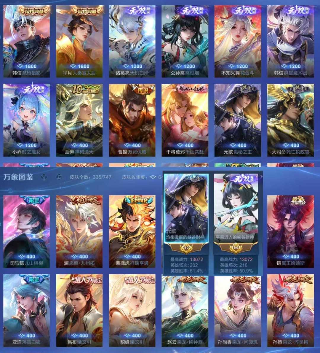女生号 贵10 多皮肤多传说 别拿那些空号v10来比 要看性价比 貂蝉武则天夏侯惇孙悟空李白鲁班小乔荣耀水晶 妲己九尾无双皮肤 80个传说 473皮肤