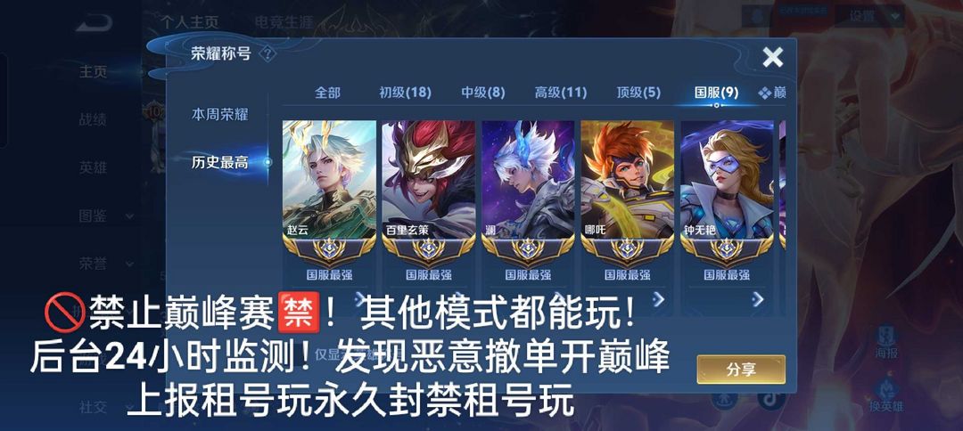 立即租号首页 > 租号大厅 > 王者荣耀 > 标题写明区服/QQ > 巅峰万强⚡2月正式服在榜小国李元芳✨84段打野v10九个大国标✨国服澜玄策孙悟空吕布❤️可排位禁巅峰