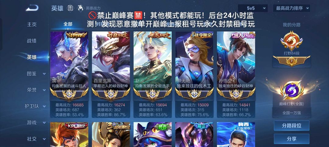 巅峰万强⚡2月正式服在榜小国李元芳✨84段打野v10九个大国标✨国服澜玄策孙悟空吕布❤️可排位禁巅峰