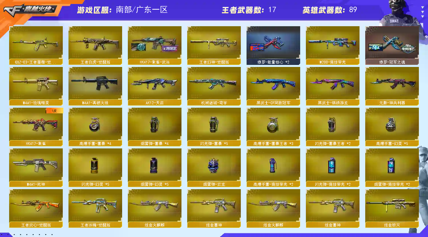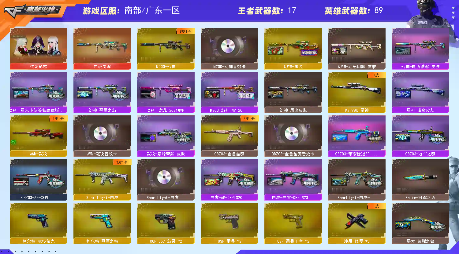 该账号已经过虚拟财产认定,若使用科技和鼠标宏等特殊外设导致账号出现问题,必追究法律责任!祝老板玩的愉快;USP-雷暴,USP-雷暴王者,柯尔特-冠军之特,炽芒蝶刃,Knife-冠军之刃,传说影煞,电竞教官-云悠悠,