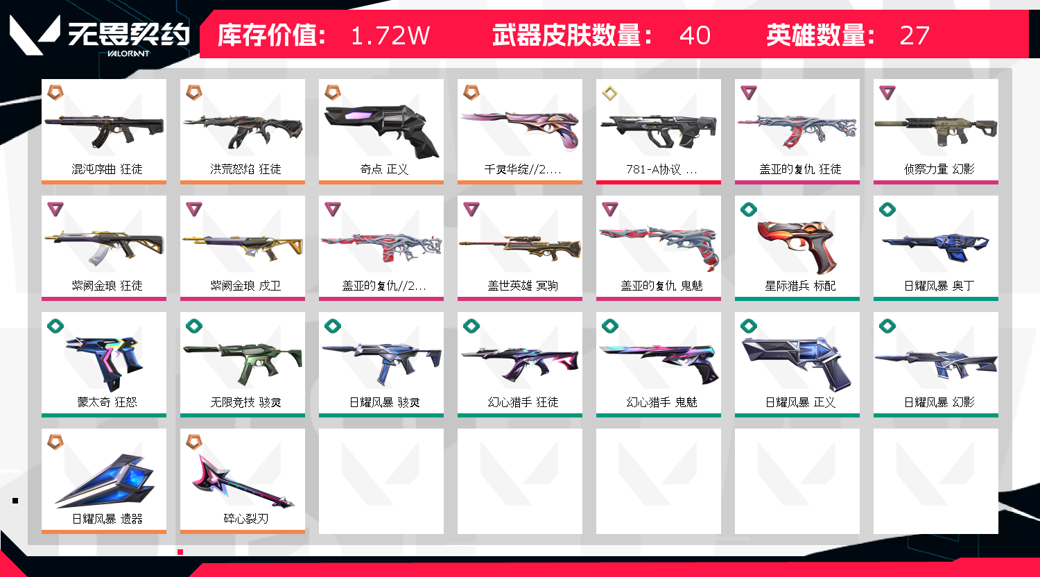 狂徒皮肤较全;盖亚的复仇 狂徒,洪荒怒焰 狂徒,侦察力量 幻影,紫阙金琅 狂徒,混沌序曲 狂徒,奇点 正义,