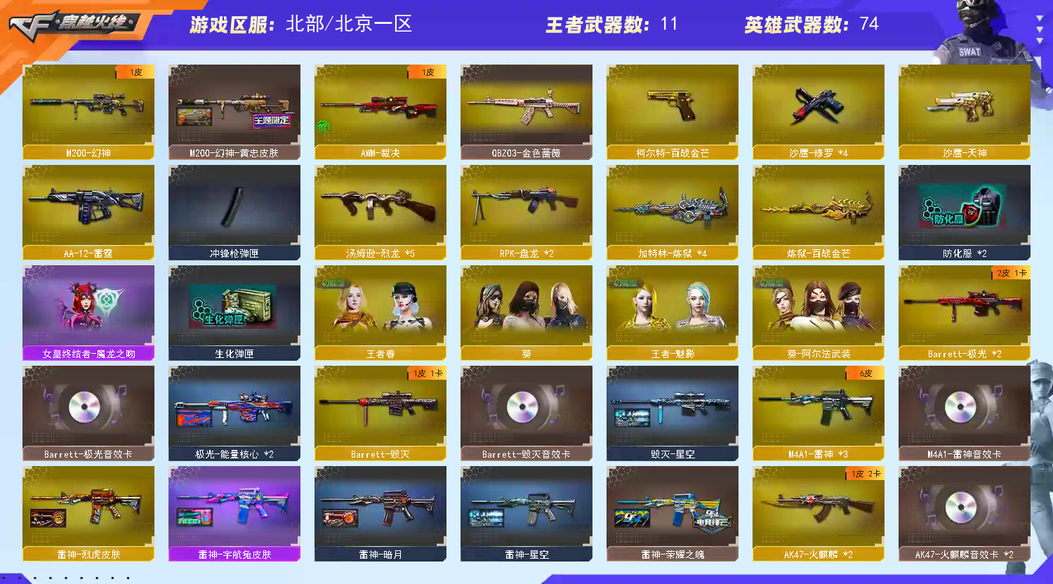 【M200幻神+黄忠皮肤+usp珊瑚】【5烈龙+5炼狱+2盘龙】【qbz03金色蔷薇】【王者之心 王者之怒】【火麒麟+火麒麟音效卡+冠军之心皮肤】【雷神+雷神音效卡+荣耀之魄皮肤】【毁灭+毁灭音效卡】【千变 黑龙 黑骑士 无影 死神 黑鲨 qbz03独角III 朱雀电竞之星 玫瑰精灵 9A91烈火 猩红传说 战神 极光 巴雷特朱雀 巴雷特金色蔷薇 AA12雷霆】——【沙鹰修罗*4 沙鹰天神 柯尔特百战金芒】——【屠龙 龙啸 擎天 麒麟刺 斩神刀雷暴 麒麟刺百战金芒 屠龙电竞之星 王者之击】——【雷暴投掷武器套装 神工天巧投掷武器套装 雷暴王者投掷武器套】——【AK47竞魂无影 巴雷特碧霄极光 雷神精英刀锋 雷神小红 水枪不败狙神 】——【角色】【4防(王者春 王者魅影)】【葵 不败狙神 零纪元】;RPK-盘龙,QBZ03-金色蔷薇,M200-幻神,