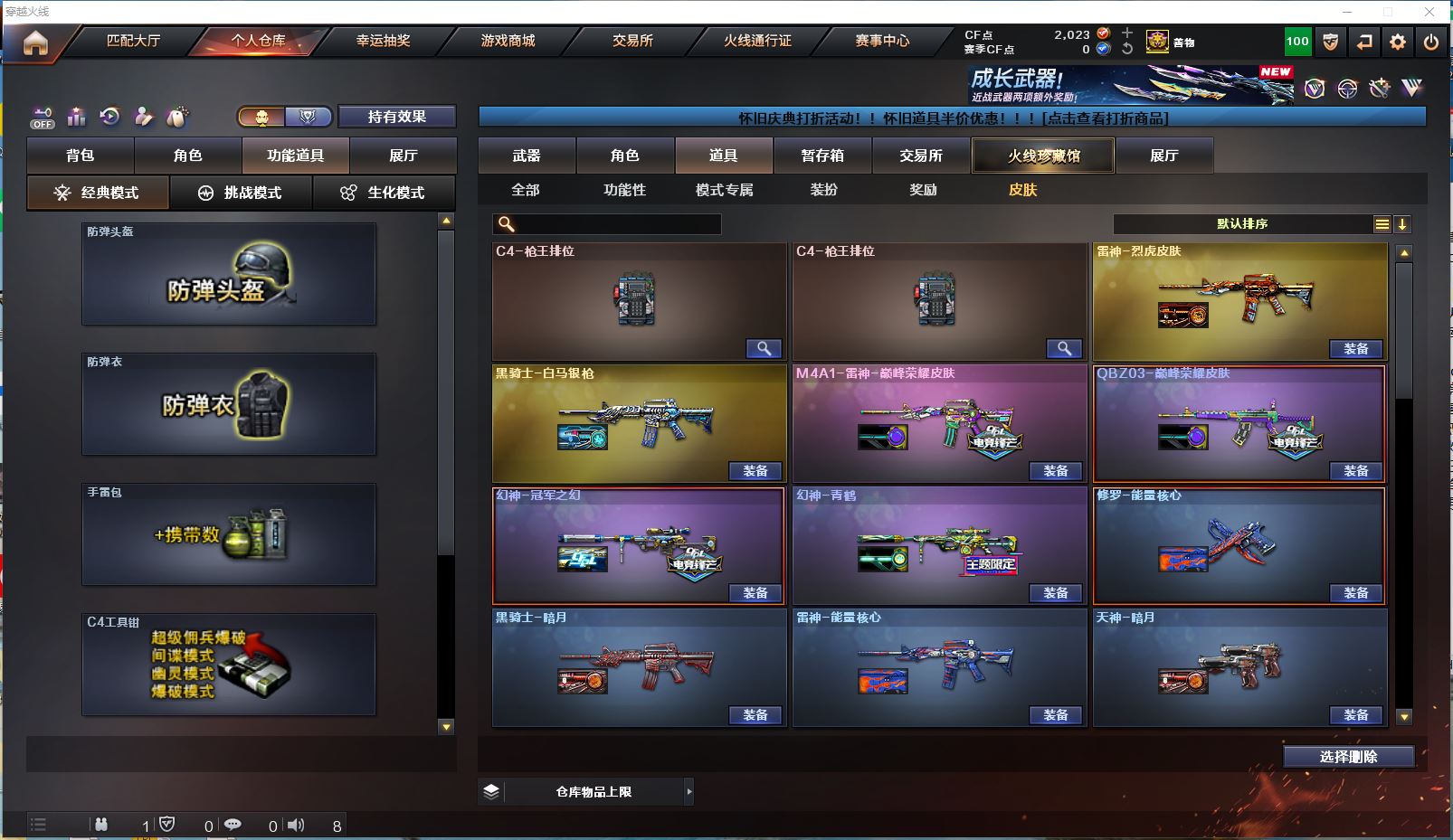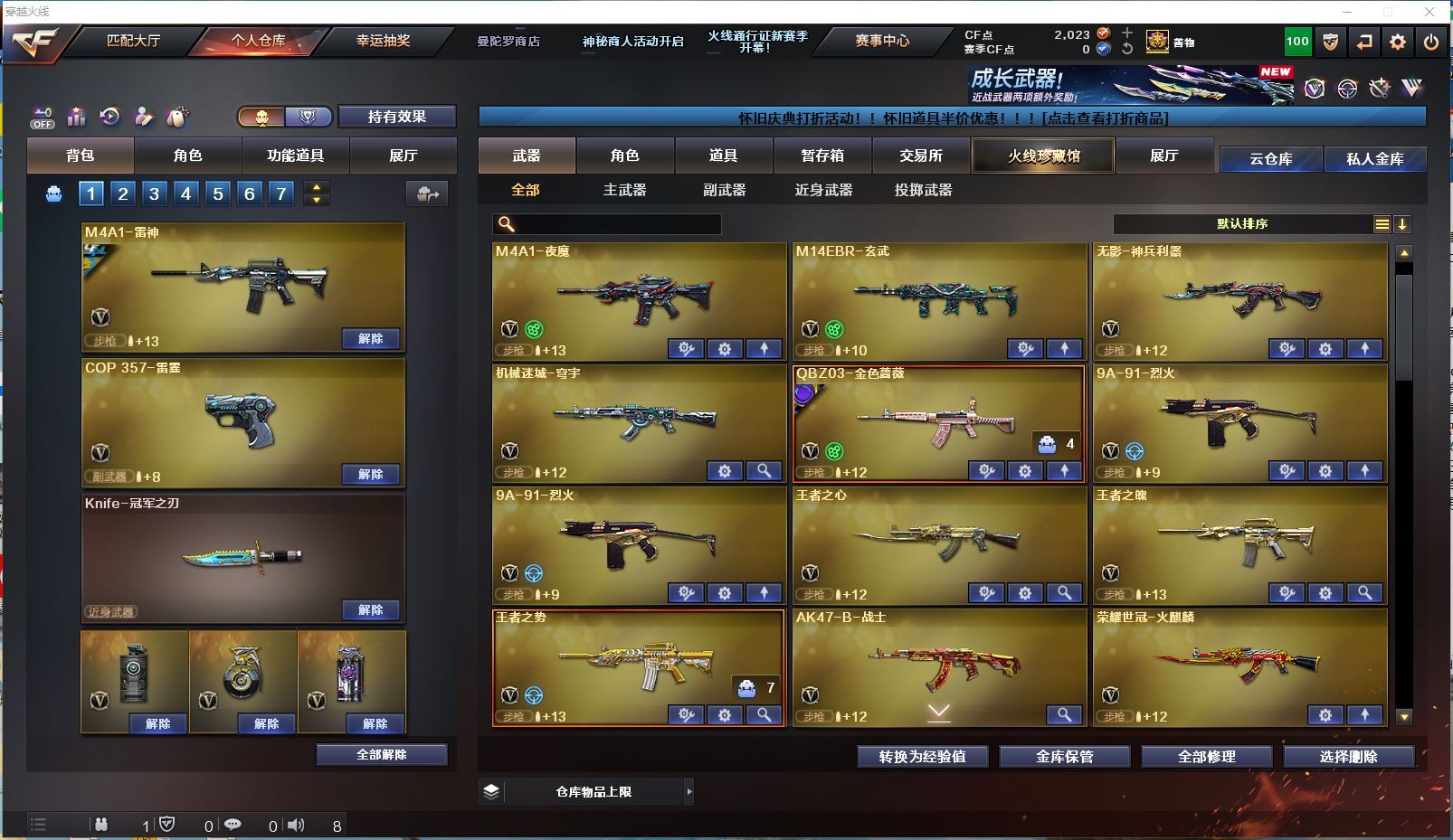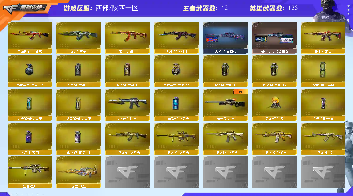 【M200幻神+冠军之幻皮肤+青鹤皮肤+usp雷暴+冠军之刃】【98k星神】【白虎+暗星皮肤+电玩粉兔皮肤】【qbz03金色蔷薇+巅峰荣耀皮肤】【传说夜影】【7盘龙+6烈龙+2炼狱+斯泰尔蝴蝶】【竞技荣光套装】【雷暴套装】【夜魔套装】【雷霆套装】【荣耀世冠火麒麟】【王者之心 王者之影 王者蔷薇 王者芳薇 王者之魄 王者之势 王者之光】【火麒麟+火麒麟音效卡+冠军之心皮肤】【黑龙+黑龙音效卡】【黑骑士+黑骑士音效卡+s4冠军典藏皮肤】【毁灭+CFPLS16冠军皮肤】【千变 黑武士 天启 黑鲨 龙血 青龙 朱雀 玄武 无影神兵利器 穹宇 9A91烈火 战士 天龙 极光 裁决】——【沙鹰修罗*5 cop357雷霆 usp雷暴 柯尔特电竞装甲】——【屠龙 尼泊尔雷霆 斩神刀雷暴 擎天竞技荣光 擎天云海游龙 丛林匕首玄豹 王者之击 荣耀世冠龙啸】——【雷霆投掷武器套装*7 雷暴投掷武器套装*5 电竞装甲投掷武器套装 玄豹投掷武器套装】——【热门武器/小人枪】【M4A1赤狱骑士 AK47再燃火线 雷神精英刀锋 毁灭孙三炮 天龙曼陀罗 炫金毁灭 斯泰尔蝴蝶 死亡之眼】——【角色】【4防(王者葵貂蝉 王者葵#若翩鸿)】【樱 炫 零纪元】;USP-雷暴,Knife-冠军之刃,RPK-盘龙,QBZ03-金色蔷薇,M200-幻神,Scar Light-白虎,Kar98K-星神,