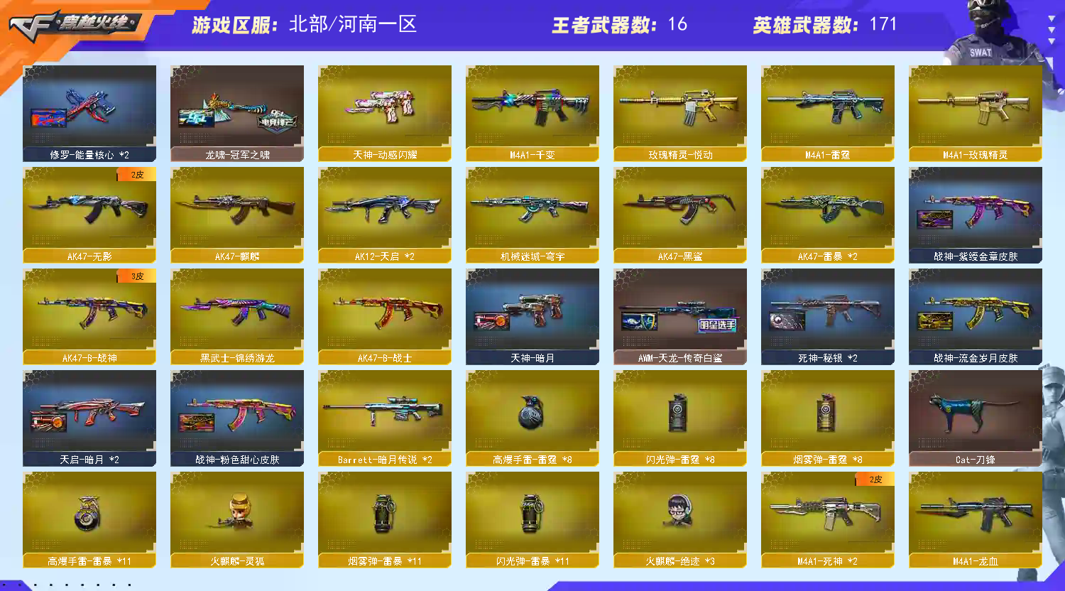 首页 > 租号大厅 > 穿越火线 > 网通区/河南一区 > 四防隼 四防迅捷虹喵 6烈6盘 三把雷暴手枪两把cop雷霆 幻神 白虎 白虎音效卡