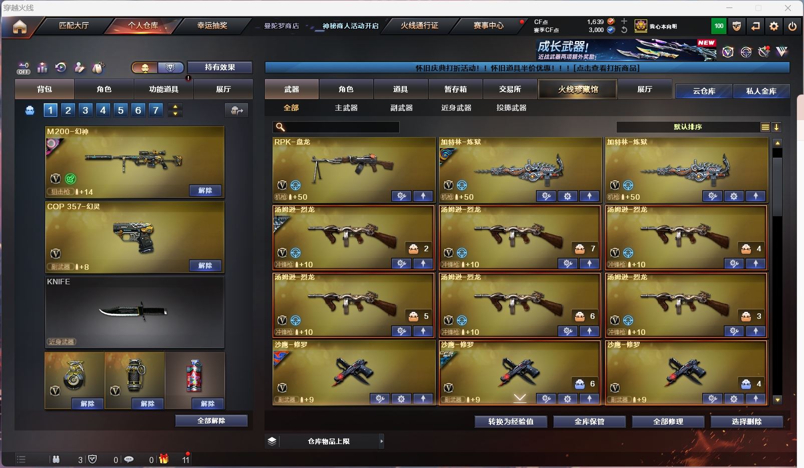 【m200幻神+宠儿】【98k星神】【6烈龙 盘龙*2 炼狱*2 斯太尔蝴蝶 】【白虎电玩】【qbz金色蔷薇】【火麒麟+even】【黑龙】【雷神+卡+白鲨冠军+n9+宠儿】【黑骑士+卡+白马银枪】【毁灭+卡+bean+荣耀之怒】【裁决】【武器:雷暴 王者之心 王者火魄 】【6手枪:修罗*4 天神 幻灵】【12刀具:屠龙*5 龙啸 麒麟刺 斩神刀雷暴 堕天神 幻灵之峰 王者之击*2】【5雷套:雷暴雷 堕天神雷 幻灵雷 竞技荣光*2】【小人枪:雷神精英刀锋 毁灭孙三炮 cop白鲨】【音效卡:黑骑士音效卡 毁灭音效卡 雷神音效卡 】【四防角色:王者葵貂蝉 】;