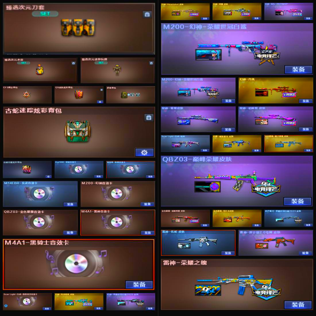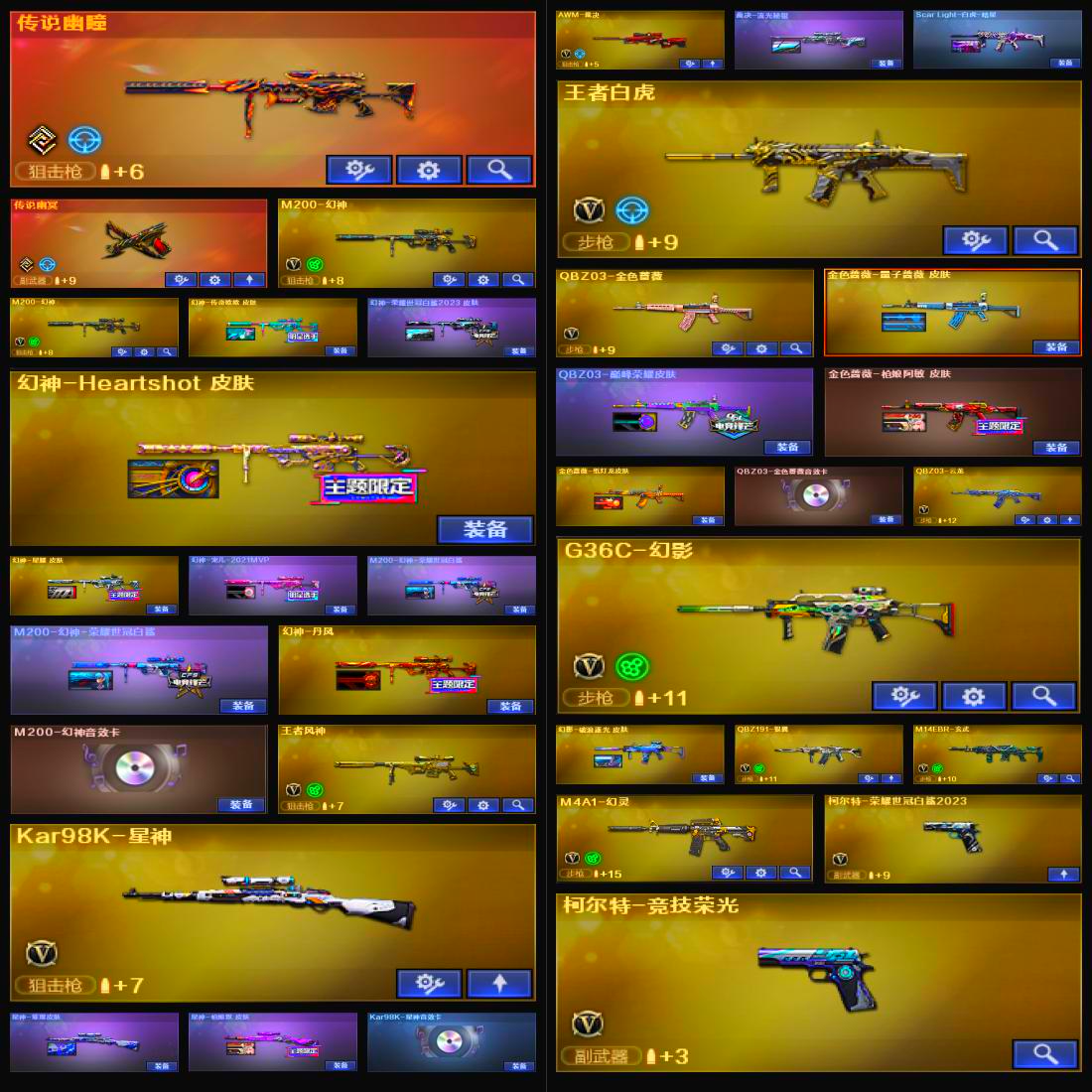 【亮点解析 幻神三件套+7皮 Kar98K-星神三件套 哔哩哔哩名片】【传说幽瞳+传说幽冥】【M200-幻神+音效卡+幻神-宠儿+幻神-荣耀世冠白鲨幻神-荣耀世冠白鲨2023+heartshot+幻神-传奇欧欧幻神-星耀+幻神-丹凤】【Kar98K-星神+音效卡+星神枪娘默+星神-璀璨】【王者风神】【G36C-幻影+破浪逐光】【王者白虎】【QBZ03-金色蔷薇+音效卡+巅峰荣耀】【生化 5盘龙 2炼狱 6烈龙】【裁决+裁决-流光秘银】【qbz银翼】【云龙套】【幻灵套】【AK47-火麒麟】【黑龙】【M4A1-雷神+音效卡+雷神-荣耀之魄】【黑骑士+音效卡】【王者之影 王者之魄 王者之势】【玄武+音效卡】【14手枪 修罗 天神*4 cop云龙*5 柯尔特荣耀世冠白鲨2023】【10近战 屠龙*3 炽芒蝶刃蝴蝶刀 云龙扇 王者之啸】【手雷 堕天神 幻灵雷 竞技荣光 云龙雷*2 雷霆王者】【四防 晴雅 王者春王者潘多拉 王者晴雅】;柯尔特-荣耀世冠白鲨2023,传说幽冥,炽芒蝶刃,隼,晴雅,RPK-盘龙,QBZ03-金色蔷薇,