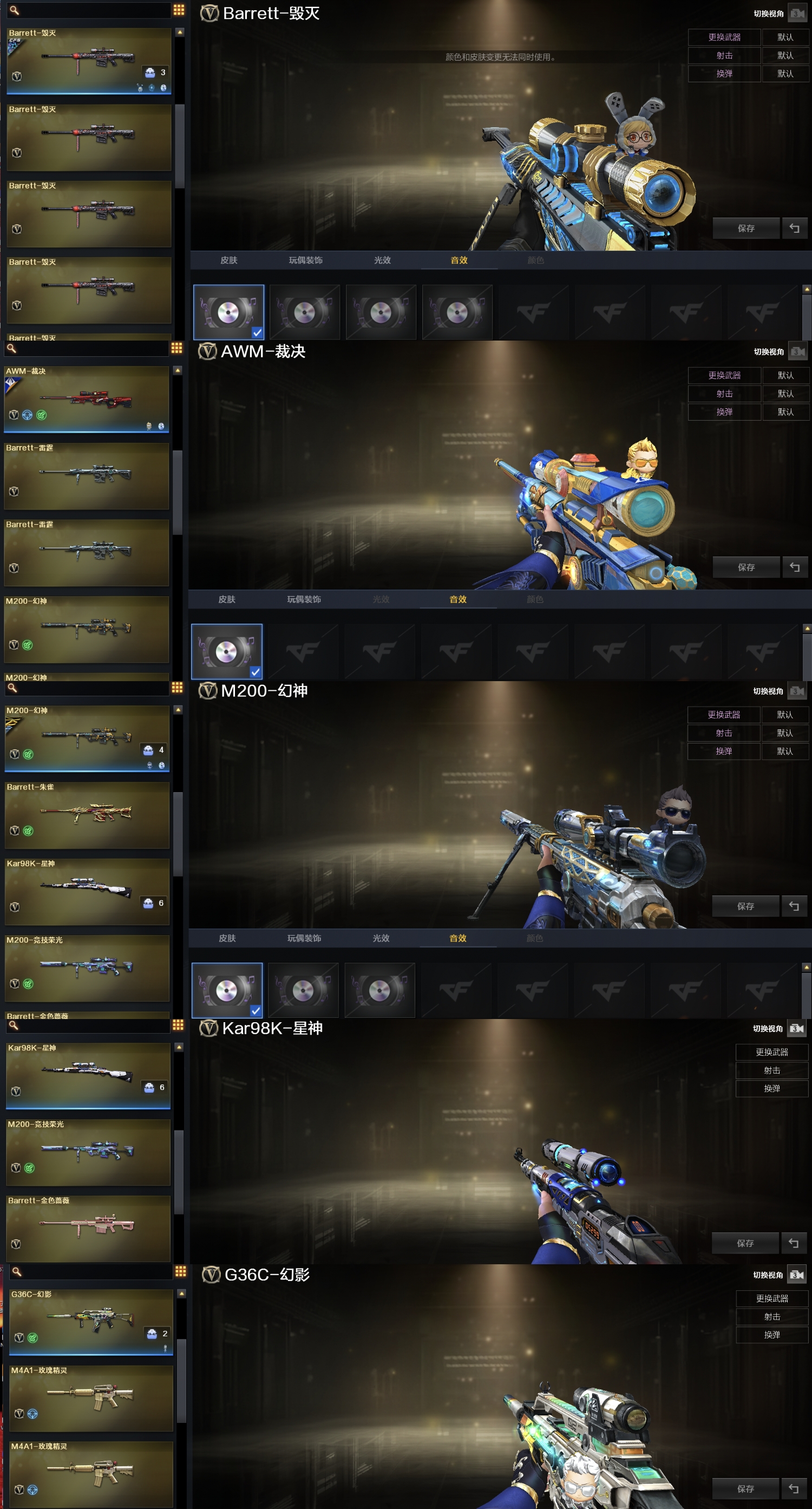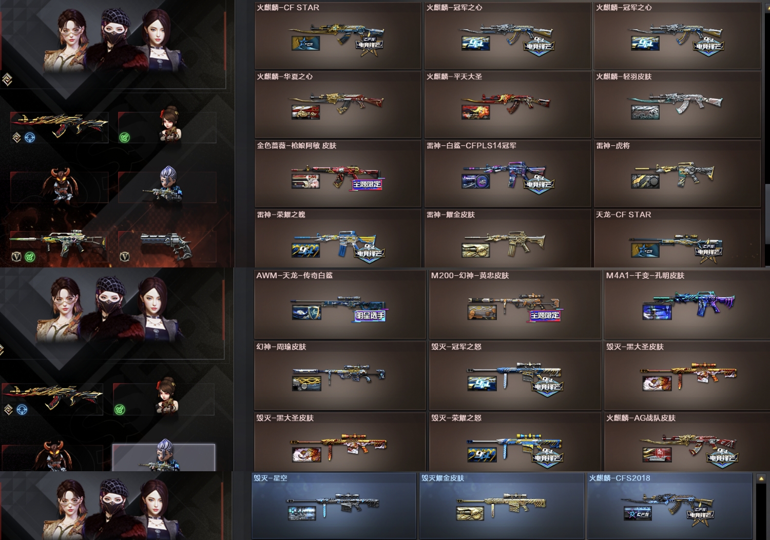 传说爱丽莎,传说夜影,5套幻兽,荣耀套,2018套,毁灭三件套,幻神三件套,QBZ三件套,雷神三件套,裁决三件套,G36C幻影;USP-雷暴,荣耀世冠-柯尔特,传说艾莉莎,RPK-盘龙,QBZ03-金色蔷薇,G36C-幻影,M200-幻神,