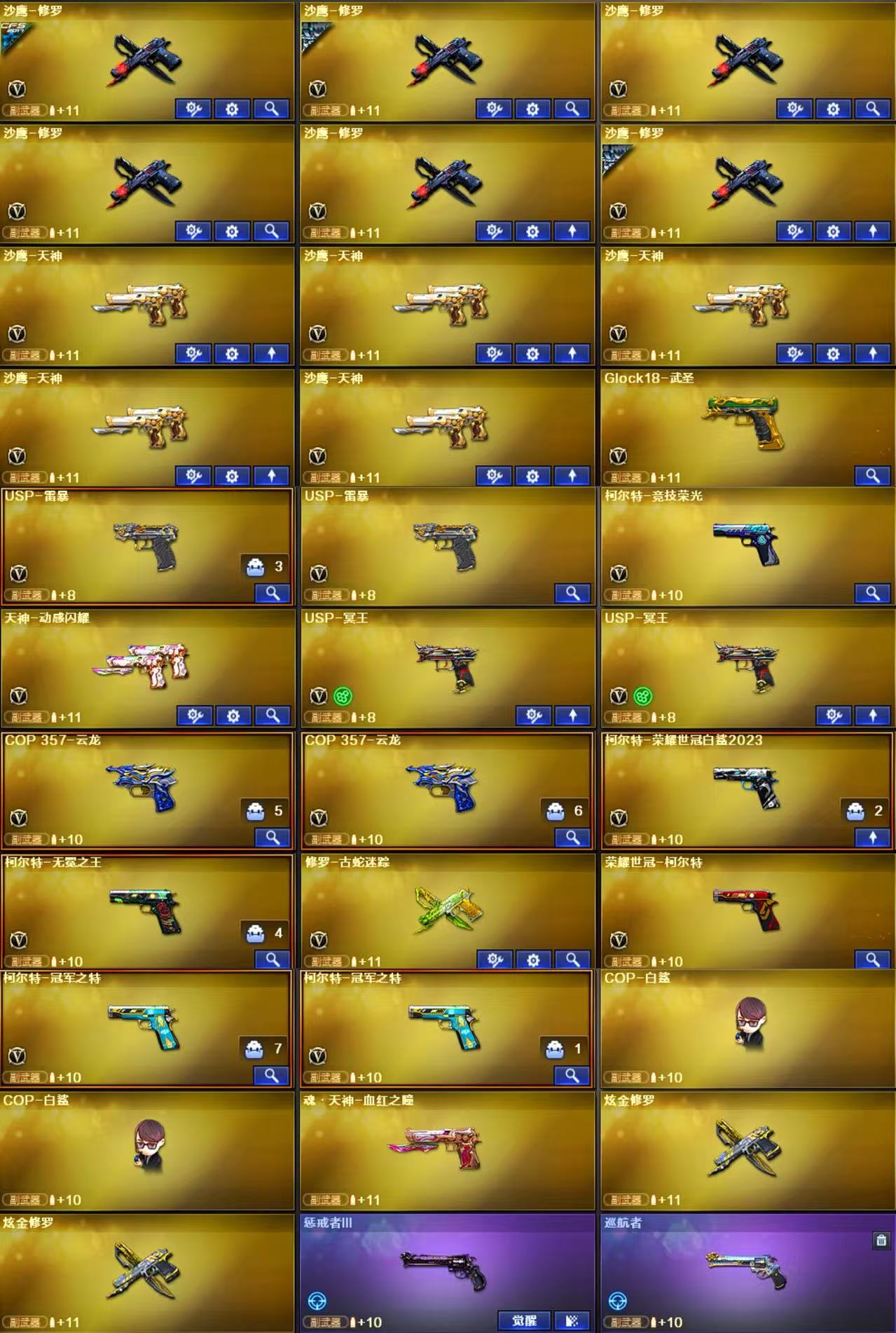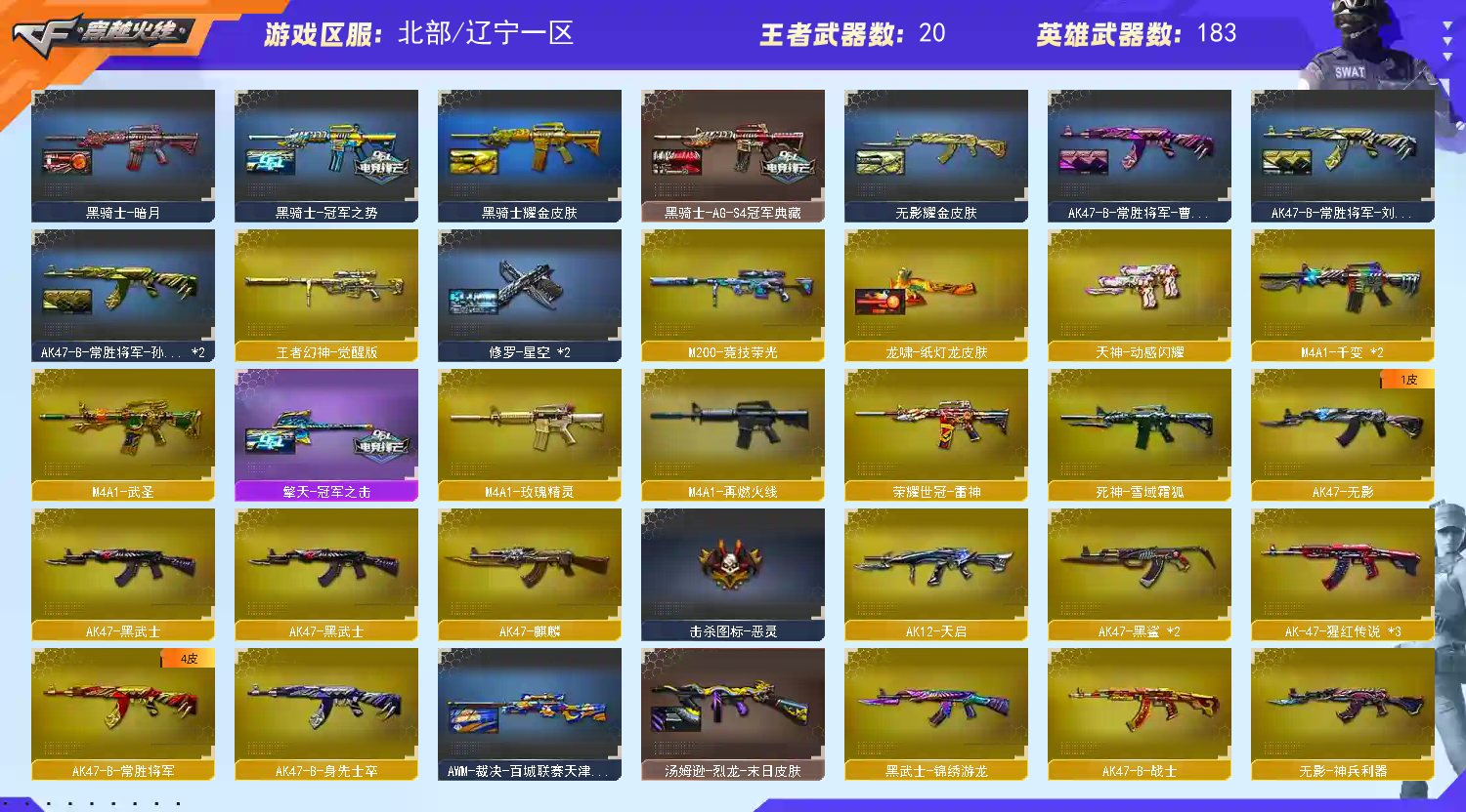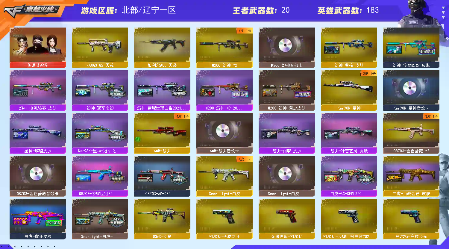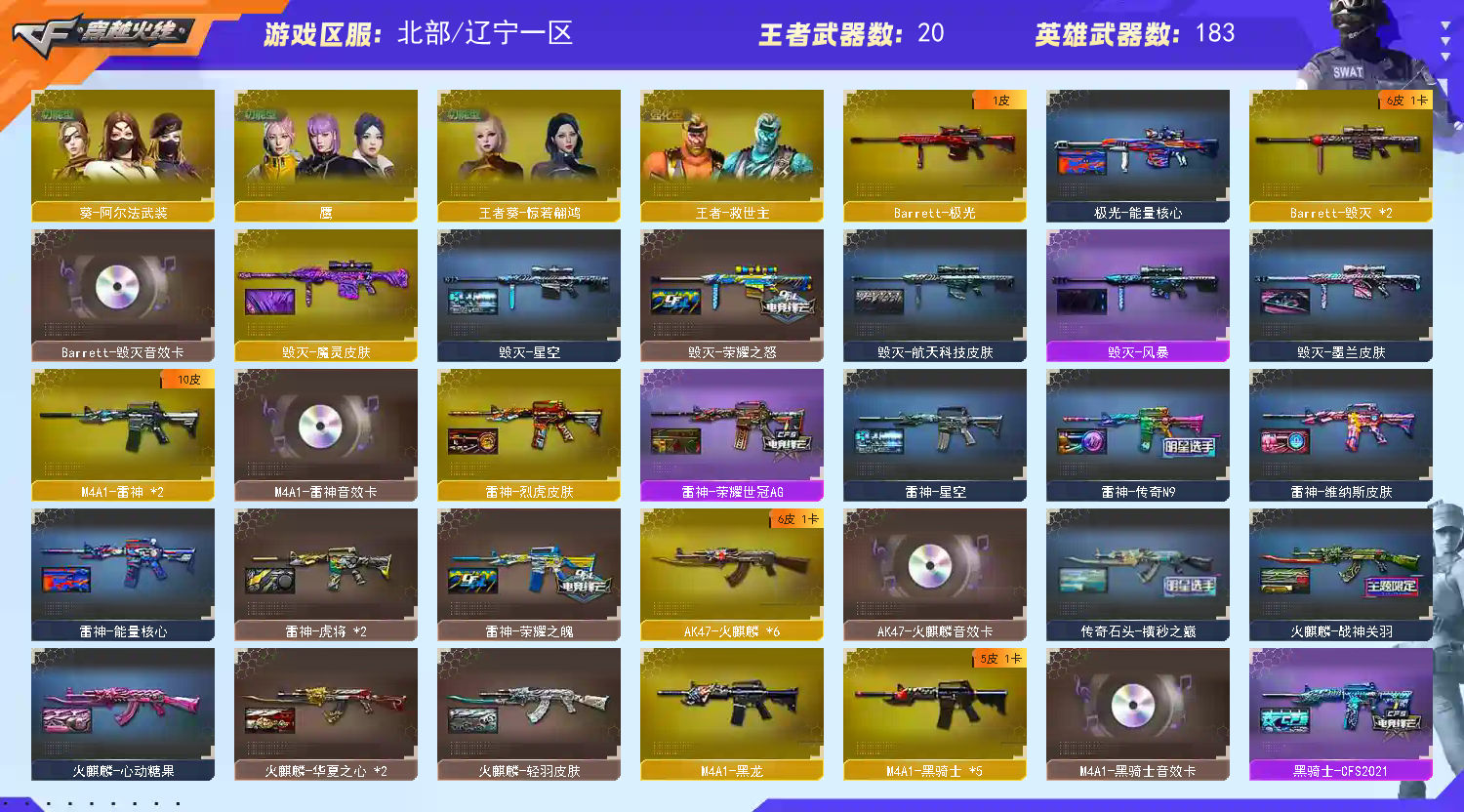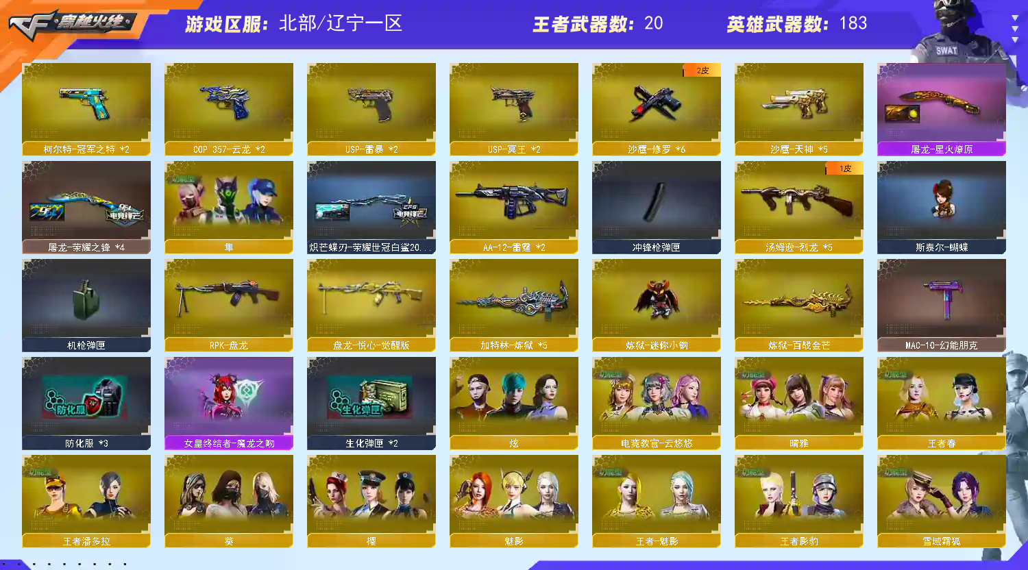 【王者武器】:【炫金天龙-3,炫金毁灭-1,王者之光-觉醒版-1,王者之击-觉醒版-1,王者之力-觉醒版-1,王者之势-觉醒版-1,王者之啸-觉醒版-2,王者之城-觉醒版-1,王者之心-觉醒版-1,王者之锋-觉醒版-1,王者之魄-觉醒版-1,王者幻神-觉醒版-1,盘龙-悦心-觉醒版-1,炫金骑士-1,炫金修罗-2】 【英雄武器】:【AK12-天启-1,M4A1-武圣-1,AN94-超新星-1,M4A1-千变-2,M4A1-黑骑士-5,M4A1-玫瑰精灵-1,AK47-黑武士-1,屠龙-4,龙啸-2,AK47-无影-1,麒麟刺-4,AK47-火麒麟-6,AK47-麒麟-1,AWM-天龙-1,Barrett-毁灭-2,汤姆逊-烈龙-5,Barrett-极光-1,RPK-盘龙-1,沙鹰-修罗-6,加特林-炼狱-5,沙鹰-天神-5,Glock18-武圣-1,M4A1-雷神-2,M4A1-黑龙-1,9A91-烈火-1,M200-幻神-2,USP-雷暴-2,烈龙-云海游龙-1,高爆手雷-雷暴-4,闪光弹-雷暴-4,烟雾弹-雷暴-4,斩神刀-雷暴-1,M200-竞技荣光-1,擎天-竞技荣光-1,柯尔特-冠军之特-2,柯尔特-竞技荣光-1,烟雾弹-竞技荣光-4,闪光弹-竞技荣光-3,高爆手雷-竞技荣光-3,Scar Light-白虎-1,炽芒蝶刃-1,高爆手雷-神工天巧-2,闪光弹-神工天巧-3,AK-47-猩红传说-3,无影-神兵利器-1,AA-12-雷霆-2,Barrett-暗月传说-1,QBZ03-金色蔷薇-2,FAMAS G2-天戎-1,USP-冥王-2,加利尔ACE-天袭-1,闪光弹-玄豹-1,HK417-朱雀-1,G36C-幻影-1,烈火-动感闪耀-1,手雷-动感闪耀-1,天神-动感闪耀-1,擎天-云海游龙-1,屠龙-动感闪耀-1,柯尔特-荣耀世冠白鲨2023-1,柯尔特-无冕之王-1,超新星-热带奇洋-1,Kar98K-星神-1,黑武士-锦绣游龙-1,龙啸-热带奇洋-1,手雷-热带奇洋-1,云龙扇-2,COP 357-云龙-2,高爆手雷-云龙-7,烟雾弹-云龙-7,闪光弹-云龙-7,擎天-4,AWM-裁决-1,AK47-B-常胜将军-1,AK47-B-身先士卒-1,荣耀世冠-柯尔特-1,荣耀世冠-雷神-1,闪光弹-幻灵-1,龙啸-烈火龙威-1,M4A1-猎神-1,AK47-黑鲨-2,AK47-B-战士-1,M4A1-龙血-2,手雷-云海游龙-1】 【装饰品】:【火麒麟-CF STAR-1,天龙-CF STAR-1,修罗-CF STAR-1,黑龙-暗月-1,黑骑士-暗月-1,雷神-能量核心-1,极光-能量核心-1,神秘男孩玩偶-1,巨人玩偶-1,魔翼龙玩偶-1,刀锋玩偶-1,铁骑玩偶-1,泰迪娃娃-1,DJ喵-1,王者刀锋玩偶-1,击杀图标-恶灵-1,炽芒蝶刃-荣耀世冠白鲨2023 皮肤-1,AWM-天龙-传奇70KG-1,幻神-荣耀世冠白鲨2023 皮肤-1,金色幸运鼠玩偶-1,雷神-荣耀世冠AG-1,雷神-烈虎皮肤-1,哪吒玩偶-1,M4A1-千变-孔明皮肤-1,幸运猪猪玩偶-1,剑齿虎玩偶-1,火麒麟-战神关羽-1,传奇石头-横秒之巅-1,龙啸-纸灯龙 皮肤-1,夏日水手玩偶-1,曼陀罗玩偶-1,幸运鼠玩偶-1,雷神-虎将-1,火麒麟-心动糖果-1,火麒麟-华夏之心-1,火麒麟-轻羽皮肤-1,黑骑士-AG-S4冠军典藏-1,黑骑士耀金皮肤-1,无影耀金皮肤-1,雷神-星空-1,黑骑士-CFS2021-1,毁灭-星空-1,关羽玩偶-1,黑骑士-冠军之势-1,火麒麟玩偶-1,终结者玩偶-1,白虎-AG-CFPLS20冠军-1,炼狱-月 皮肤-1,白虎-虎牙皮肤-1,QBZ03-AG-CFPLS19冠军-1,战神-粉色甜心皮肤-1,战神-流金岁月皮肤-1,战神-紫绶金章皮肤-1,AK47-B-常胜将军-曹操-1,AK47-B-常胜将军-刘备-1,AK47-B-常胜将军-孙权-1,屠龙-荣耀之锋-1,雷神-荣耀之魄-1,毁灭-荣耀之怒-1,修罗-星空-1,萨满玩偶-1,十周年击杀图标-1,M200-幻神-N9-2022MVP-1,幻神-冠军之幻-1,星神-璀璨皮肤-1,汤姆逊-烈龙-末日皮肤-1,屠龙-星火燎原-1,QBZ03-荣耀世冠EP皮肤-1,白虎-百战金芒 皮肤-1,擎天-冠军之击-1,毁灭-墨兰 皮肤-1,毁灭-魔灵皮肤-1,毁灭-风暴-1,幻神-曹操 皮肤-1,雷神-维纳斯皮肤-1,裁决-叶芒苍灵 皮肤-1,裁决-羽掣 皮肤-1,魅影玩偶-1,CFS 击杀图标-1,绝迹语音包-1,幻神-传奇欧欧 皮肤-1,雷神-传奇N9-1,雷神-源计划2.0专属 皮肤-1,M200-幻神-黄忠皮肤-1】 【角色】:【魅影,金戈,樱,葵,堕天使,复仇者,铁骑,飞虎队,猎狐者,曼陀罗,活力灵狐,嘉年华灵狐,潘多拉-锋芒精英,木兰,游珑儿,炫,王者影豹,灵狐者-黄金海岸,鹰,电竞教官-云悠悠,传说艾莉莎,晴雅,王者葵-惊若翩鸿,王者-救世主,夜玫瑰-X,圣诞潘多拉-X,风暴女,精英部队,王者-零-传说之路,奥摩-X,潘多拉-甜心教官,虎妞,娟娟,龙儿,兰-梨园特工,斯沃特-锋芒精英,王者潘多拉,隼,麻雀,王者-魅影,雪莉杨,陈龙野-Z,芳心审判者,王者-春,社长刀锋,艾比,暗夜-X,青霞仙子,职业选手,猎狐者-追月,葵-赛博朋克】 【道具】:【超级背包-1,炫彩背包-1,烟雾保护头盔-1,闪光护目镜-1,手雷包-1,C4工具钳-1,防化服-1,灵魂忍者-1,疯狂宝贝-1,迷雾幽灵-1,步枪弹匣-1,冲锋枪弹匣-1,手枪弹匣-1,M4A1-雷神 紫橙光效-1,彩蝶之翼-1,云螭玩偶-1,Barrett-毁灭音效卡-1,M4A1-雷神音效卡-1,AK47-火麒麟音效卡-1,M4A1-黑骑士音效卡-1,HK417-朱雀音效卡-1,M200-幻神音效卡-1,烈火-动感闪耀音效卡-1,天神-动感闪耀音效卡-1,屠龙-动感闪耀音效卡-1,小萝莉-1,QBZ03-金色蔷薇音效卡-1,Scar Light-白虎音效卡-1,背包-洛丽塔-1,天使之翼-1,绿色巨人-1,黄金头骨护目镜-1,天使光环-1,Kar98K-星神音效卡-1,AWM-裁决音效卡-1】;USP-雷暴,柯尔特-无冕之王,荣耀世冠-柯尔特,柯尔特-荣耀世冠白鲨2023,柯尔特-冠军之特,炽芒蝶刃,Knife-冠军之刃,