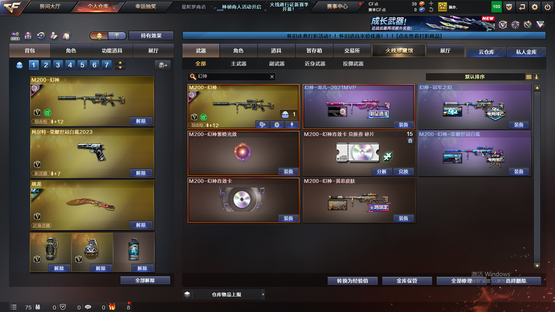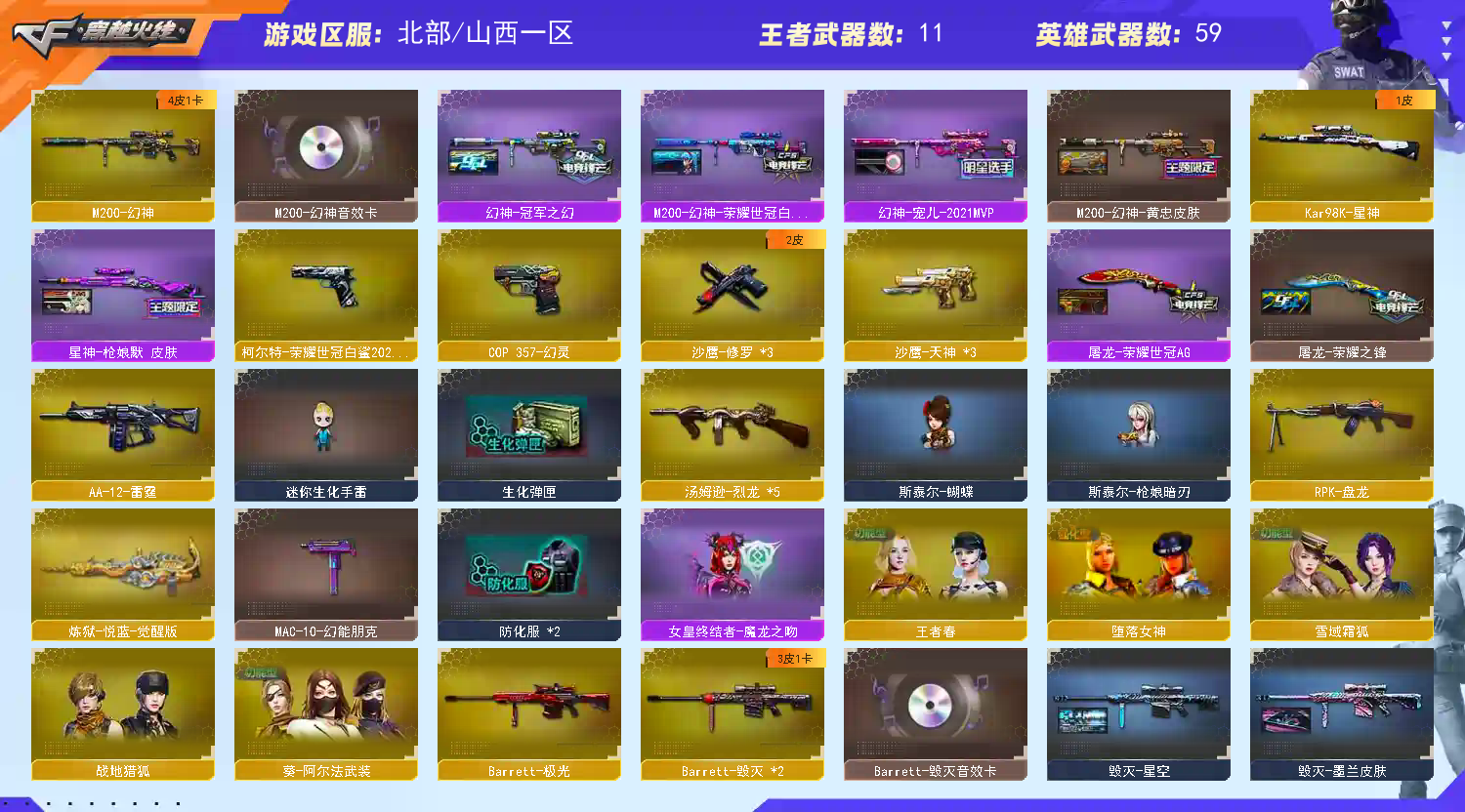 幻神音效卡;柯尔特-荣耀世冠白鲨2023,RPK-盘龙,M200-幻神,Kar98K-星神,