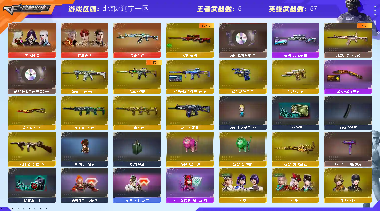 -神威莲华/传说影煞/7把蝴蝶刀炽芒蝶刃/双玄武/护林狮/啵啵狮/斯泰尔蝴蝶/裁决带卡/炽渊之怒/满雷;炽芒蝶刃,传说影煞,QBZ03-金色蔷薇,G36C-幻影,Scar Light-白虎,传说圣谕,
