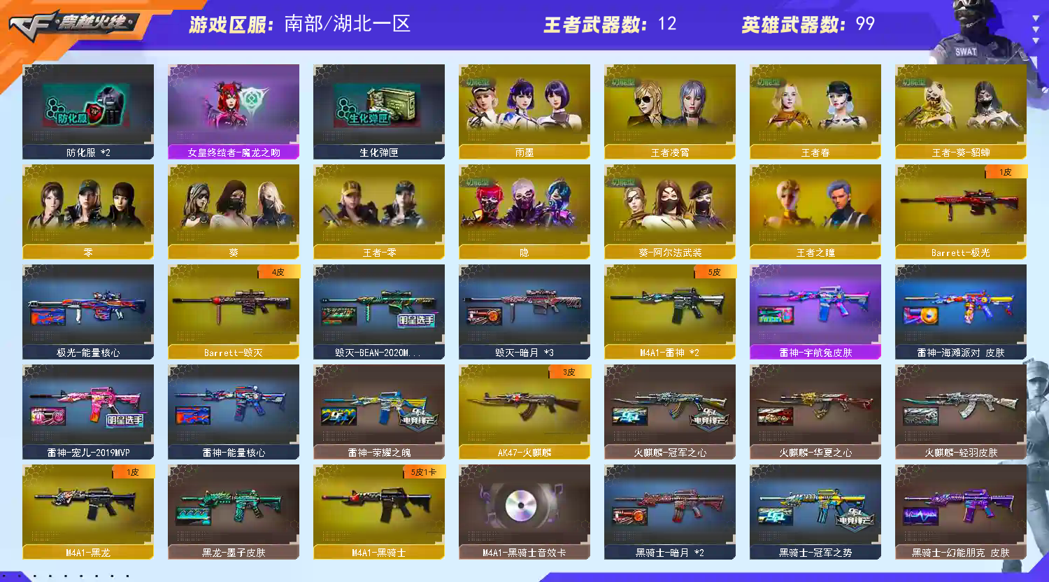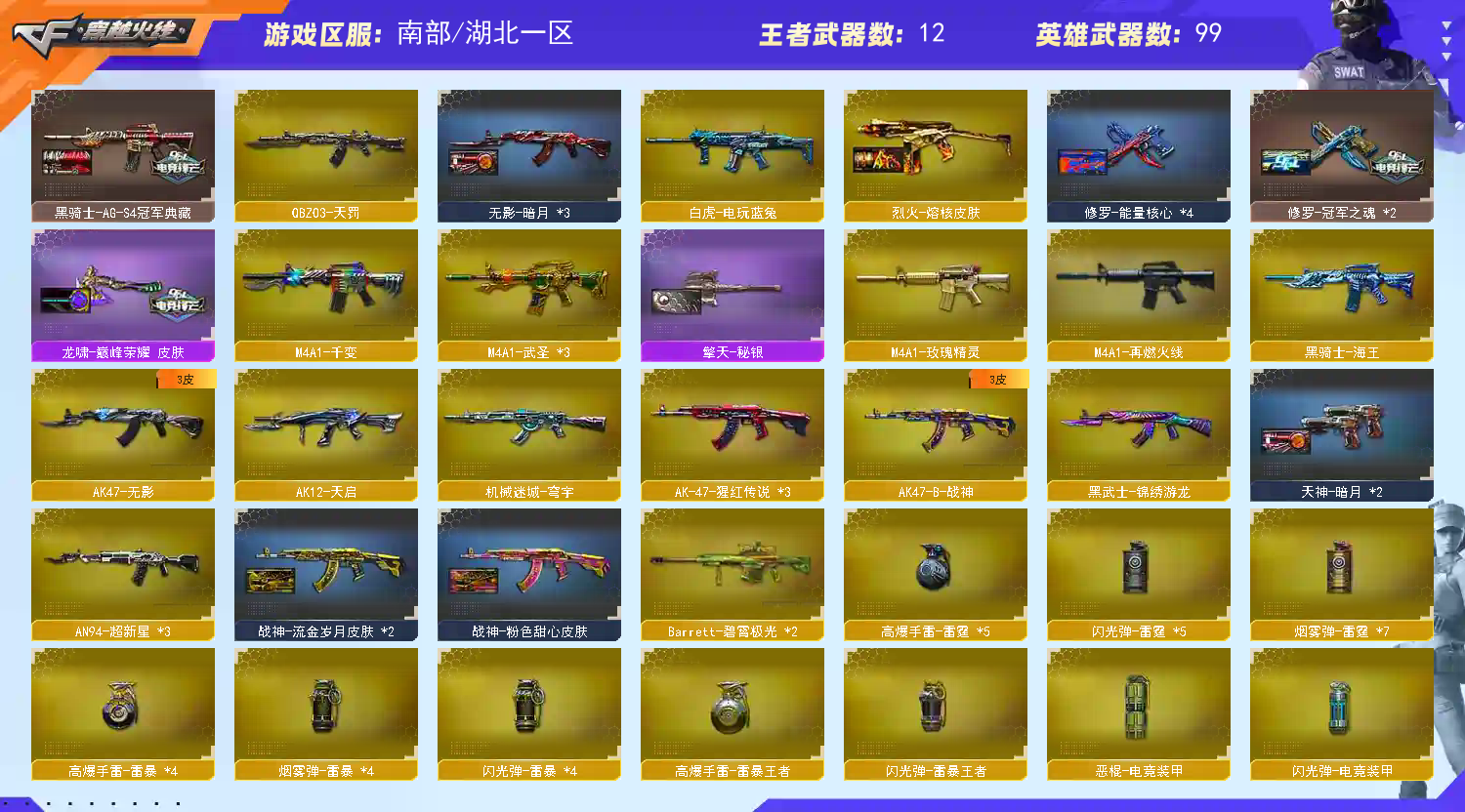 各位老板,上不去号的重启上号器给如有频繁登录,关闭Wegame,重新登录上号器,本账号已经在公安局做了虚以财产登记。若是因为外挂行为导致账号被封。u号zu实ming制的。还有游戏ip登录记录,不管你在哪都能找到你你,最后造成的财产损失,不是你承担就是你家人承担。切勿以身犯法。文明游戏,挂机拉黑 请老板完成对局后再下线.祝老板游戏愉快把把mvp;USP-雷暴,USP-雷暴王者,柯尔特-冠军之特,炽芒蝶刃,Knife-冠军之刃,妮妮,QBZ03-金色蔷薇,
