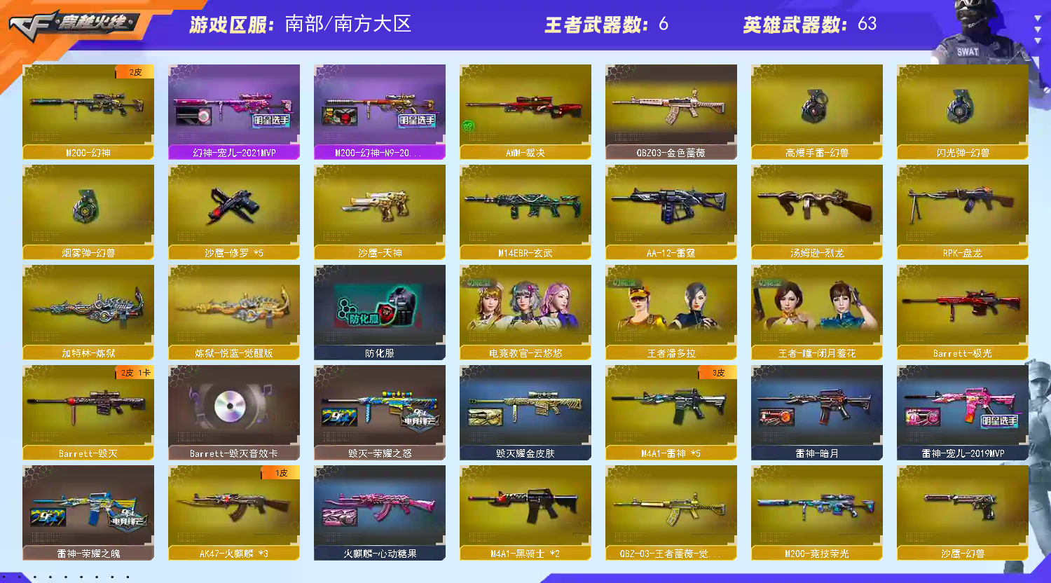 【m200幻神+n9皮肤+宠儿+幻兽雷】【m200竞技荣光+云悠悠】【qbz金色蔷薇】【玄武】【火麒麟+cfs2018】【雷神+荣耀之魄+宠儿】【黑骑士】【毁灭+卡+荣耀之怒+ag15冠军】【极光】【裁决 】【武器:青龙 qbz王者蔷薇 王者之武 盘龙 炼狱*2 烈龙 】【7手枪:修罗*5 天神 沙鹰幻兽 】【7刀具:龙啸 擎天 麒麟刺 幻灵之峰 竞技荣光 女皇利刃幻兽】【5雷套:幻灵雷 竞技荣光*3 幻兽雷】【音效卡:毁灭音效卡 】【四防角色:王者潘多拉】;电竞教官-云悠悠,RPK-盘龙,QBZ03-金色蔷薇,M200-幻神,