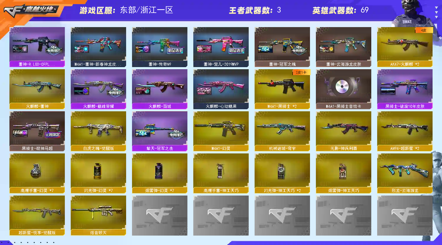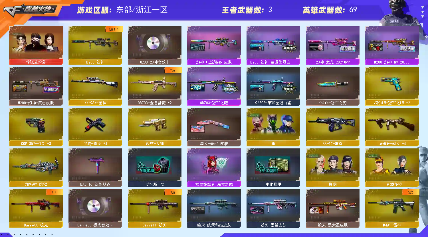 【四防传说艾莉莎】【m200幻神+幻神音效卡+黄忠+电流骇客+宠儿+n9皮肤+荣耀世冠白鲨 +冠军之特*2+冠军之刃】【98k星神】【5烈龙 炼狱】【白虎之魄】【qbz金色蔷薇+冠军之薇+荣耀世冠白鲨】【火麒麟+巅峰荣耀】【雷神+冠军之魄+s18冠军+宠儿】【黑骑士+卡】【毁灭+ag15冠军】【极光+卡】【幻灵套】【武器:幻灵】【9手枪:修罗*4 天神 幻灵*3】【9刀具:屠龙*3 擎天 麒麟刺 幻灵之峰*2 神工天巧 】【8雷套:幻灵雷*7 神工天巧雷】【小人枪:雷神枪娘雷安娜 cop白鲨】【音效卡:极光音效卡 幻神音效卡 黑骑士音效卡 】【四防角色:影豹 隼 王者潘多拉】;柯尔特-冠军之特,Knife-冠军之刃,隼,传说艾莉莎,QBZ03-金色蔷薇,M200-幻神,Kar98K-星神,