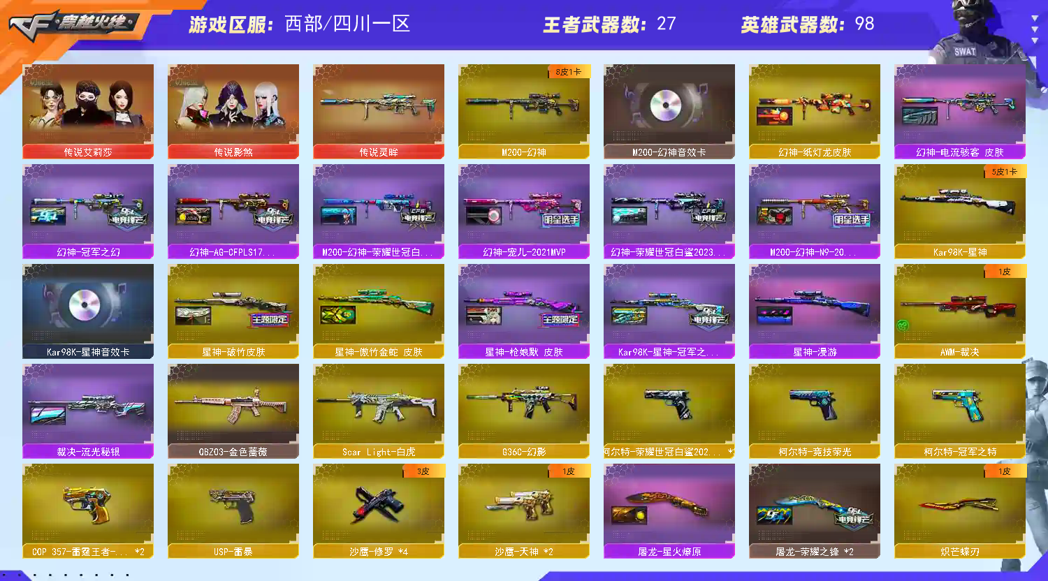 幻神8皮带卡 星神5皮带卡 生化满配】【四防传说艾莉莎】【传说影煞】【传说灵眸】【m200幻神+幻神音效卡+纸灯龙+电流骇客+宠儿+冠军之幻+ag17冠军+n9皮肤+荣耀世冠白鲨+荣耀世冠白鲨2023】【98k星神+星神音效卡 +傲竹金蛇+破竹+枪娘+冠军之星+漫游】【m200竞技荣光套+usp雷暴+四防云悠悠】【盘龙*2 炼狱*4 6烈龙 炼狱小刚 斯太尔蝴蝶 炽芒蝶刃+荣耀世冠白鲨2023】【g36c幻影】【scar白虎】【qbz金色蔷薇】【qbz天罚 】【火麒麟+卡】【黑龙】【雷神+卡+宠儿+荣耀之魄】【黑骑士+卡】【毁灭+卡+荣耀之怒】【极光】【裁决+流光秘银 】【武器:武圣 王者之影 qbz王者蔷薇 雷霆王者 王者风势 】【12手枪:修罗*4 天神 武圣 雷暴 竞技荣光 柯尔特荣耀世冠白鲨*3 雷霆王者*2 冠军之特 】【12刀具:屠龙 龙啸 擎天 麒麟刺 竞技荣光 王者之锋 神工天巧 王者之啸*2 王者之击 】【8雷套:竞技荣光雷*7 雷暴王者】【小人枪:雷神精英刀锋 cop白鲨】【音效卡:星神音效卡 火麒麟音效卡 雷神音效卡 毁灭音效卡 黑骑士音效卡 幻神音效卡 】【四防角色:云悠悠 鹰 王者玲珑小乔 王者潘多拉 王者葵貂蝉 王者沙漠玫瑰 王者炫】;USP-雷暴,柯尔特-荣耀世冠白鲨2023,柯尔特-冠军之特,炽芒蝶刃,传说影煞,电竞教官-云悠悠,王者沙漠玫瑰,