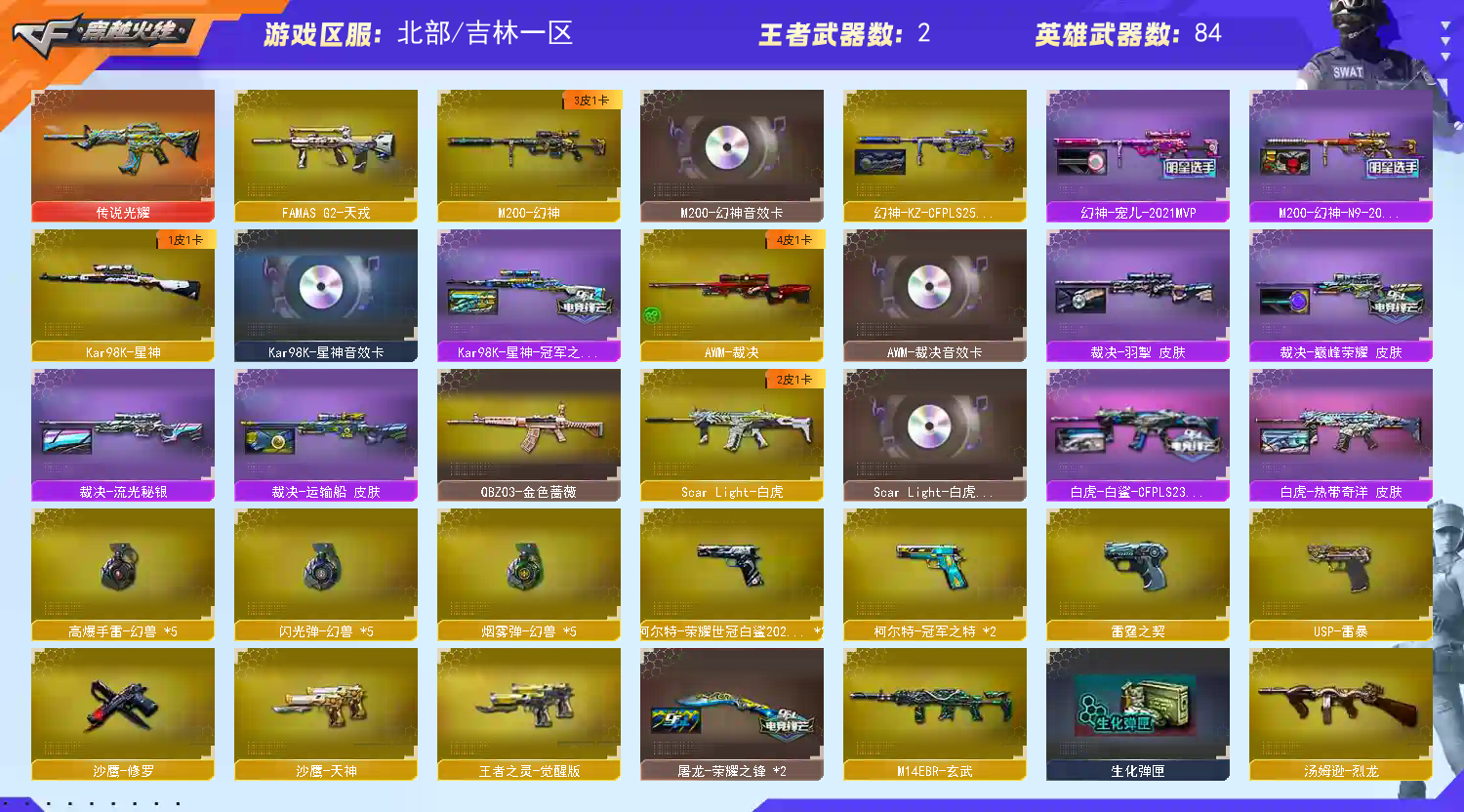 北部五套幻兽 幻神KZ宠儿n9三皮幻神音效卡 星神冠军之星星神音效卡 裁决流光巅峰4皮裁决音效卡 2白鲨柯尔特 2冠军之特 雷暴USP 雷霆COP 白虎白鲨 法码斯天戎;USP-雷暴,柯尔特-荣耀世冠白鲨2023,柯尔特-冠军之特,QBZ03-金色蔷薇,M200-幻神,Scar Light-白虎,Kar98K-星神,