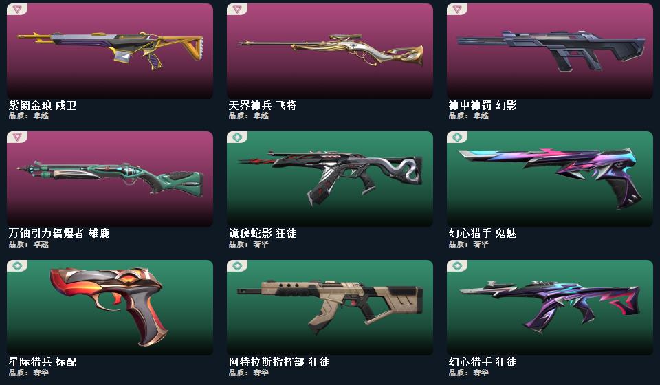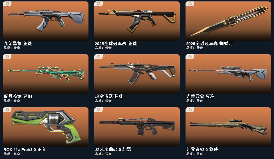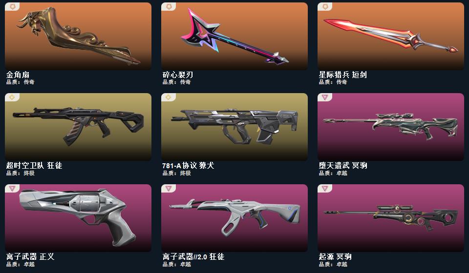 wegame无畏契约★碎心裂刃,星际猎兵 短剑,2025全球冠军赛 蝴蝶刀,金角扇,幻心猎手 鬼魅,甜心猎手 蜂刺,万铀引力辐爆者 雄鹿,紫阙金琅 戍卫,诛心猎手 冥驹,诛心猎手 奥丁