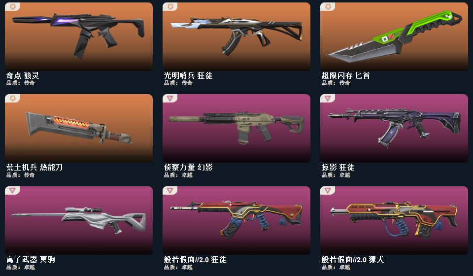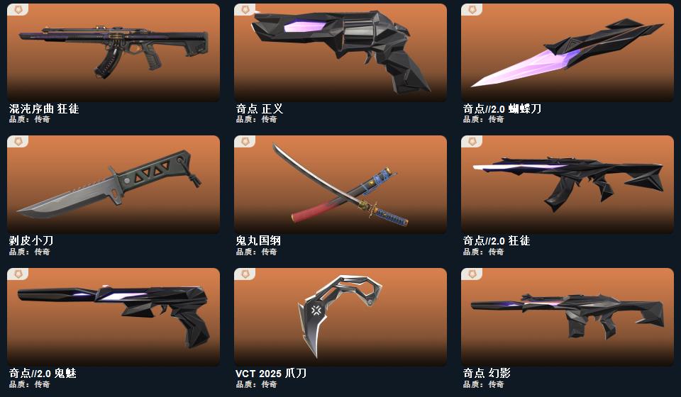 wegame无畏契约★VCT 2025 爪刀,剥皮小刀,荒土机兵 热能刀,鬼丸国纲,超限闪存 匕首,奇点//2.0 蝴蝶刀,日耀风暴 正义,荒土机兵 骇灵,逆冲蛮牛 雄鹿,侦察力量 幻影,离子武器 冥驹,般若假面//2.0 战神