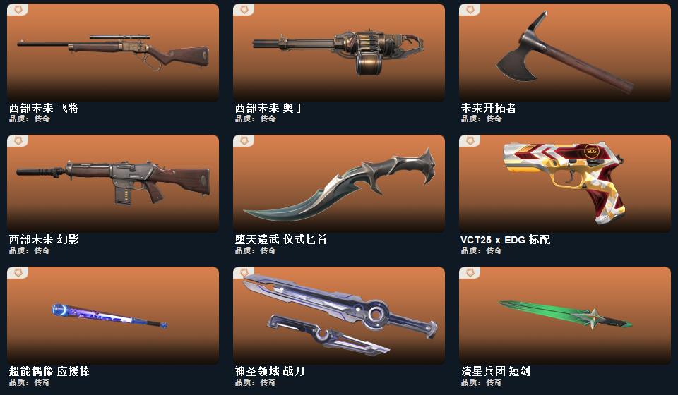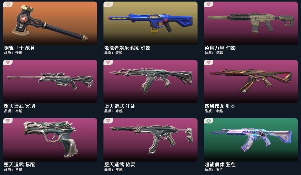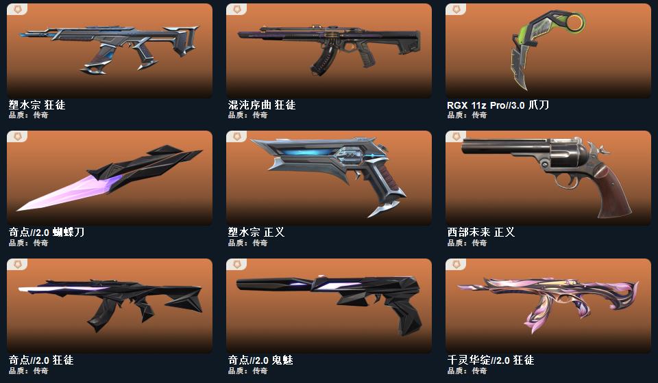 wegame无畏契约★神圣领域 战刀,未来开拓者,奇点//2.0 蝴蝶刀,超能偶像 应援棒,RGX 11z Pro//3.0 爪刀,流星兵团 短剑,堕天遗武 仪式匕首,钢轨卫士 战锤,星云暗涌 骇灵,月球哨兵 雄鹿,源能者娱乐系统 幻影,星云暗涌 冥驹
