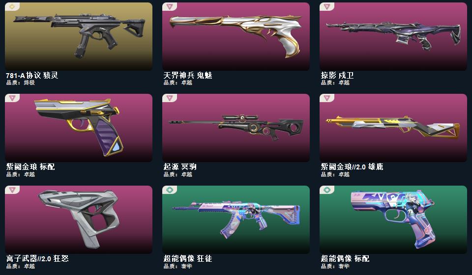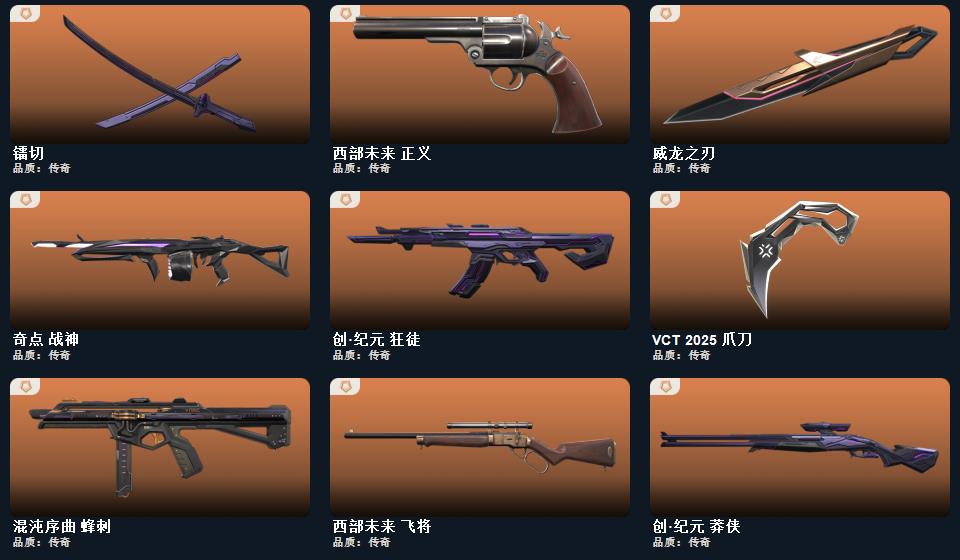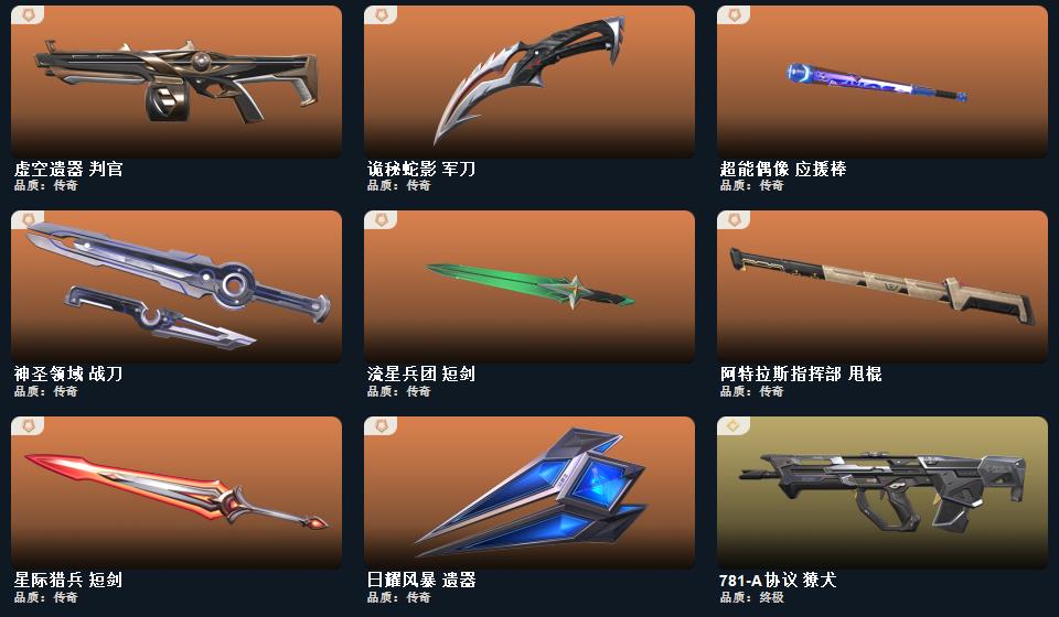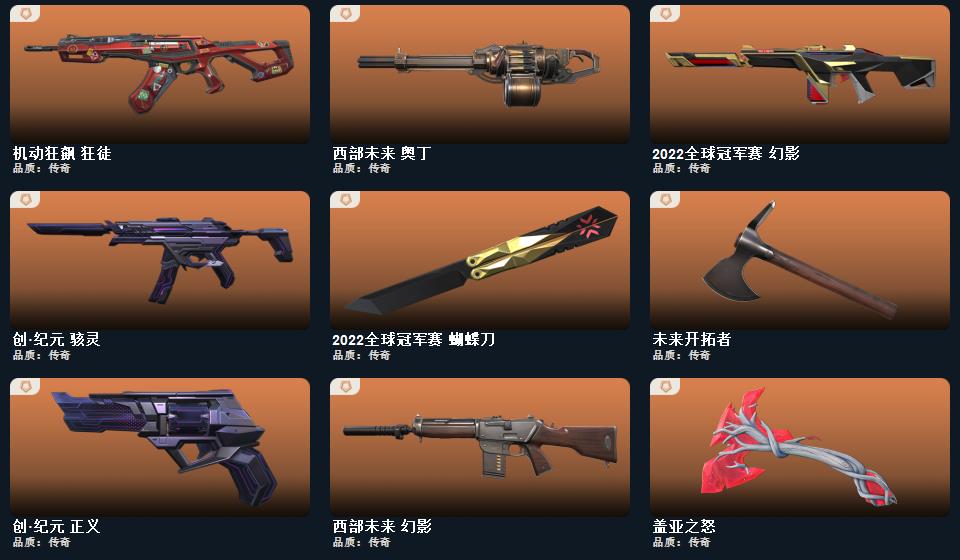 2022全球冠军赛 蝴蝶刀,日耀风暴 遗器,诡秘蛇影 军刀,威龙之刃,VCT 2025 爪刀,神圣领域 战刀,未来开拓者,镭切,盖亚之怒,超能偶像 应援棒,流星兵团 短剑,游戏结束 正义,瑰梦艺语 狂徒,光环序列 冥驹,光环序列 战神