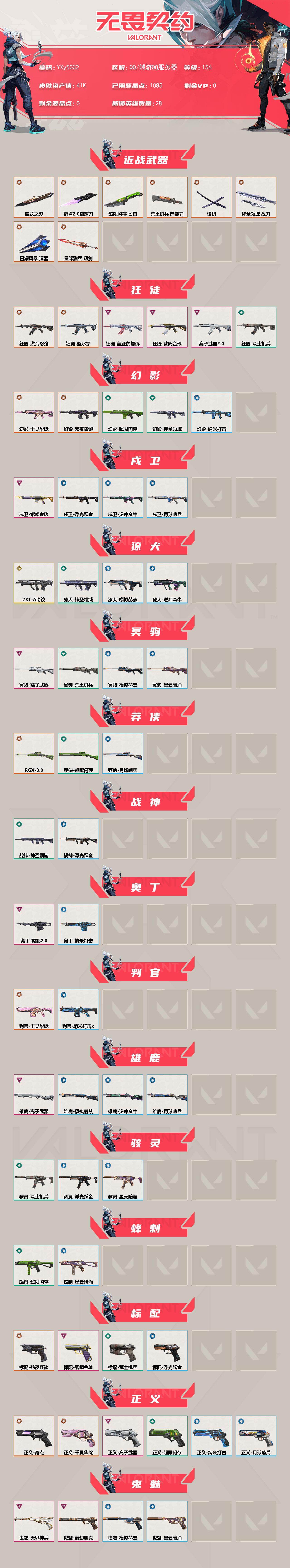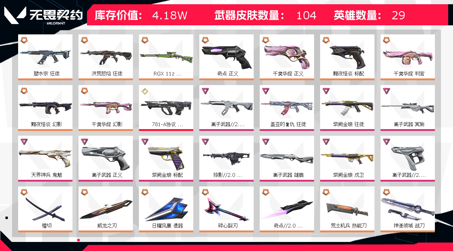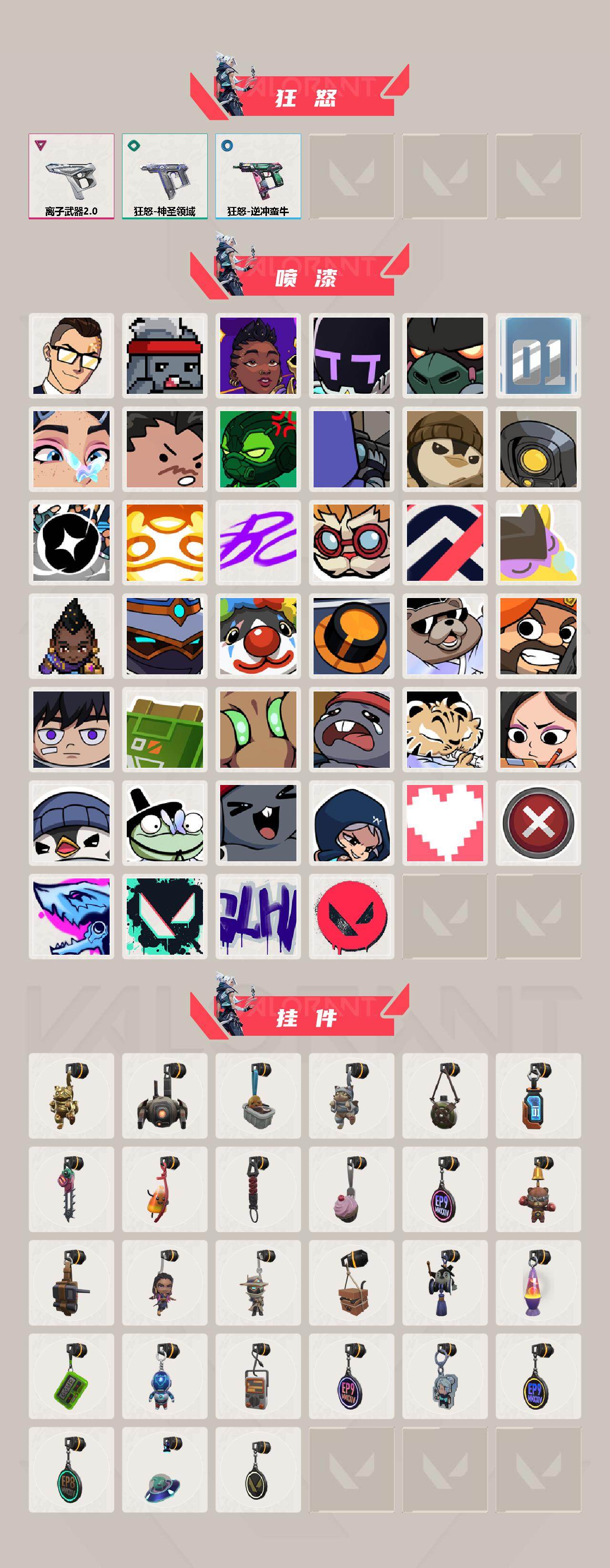 【英雄】:幻棱,炼狱,维斯,暮蝶,钛狐,壹决,铁臂,捷风,雷兹,幽影,不死鸟,贤者,猎枭,蝰蛇,零,芮娜,奇乐,尚勃勒,霓虹,斯凯,夜露,星礈,K/O,海神,盖可,黑梦,钢锁 【近战武器】:近战武器-奇点//2.0 蝴蝶刀,近战武器-镭切,近战武器-威龙之刃,近战武器-超限闪存 匕首,近战武器-荒土机兵 热能刀,近战武器-神圣领域 战刀,近战武器-日耀风暴 遗器,近战武器-星际猎兵 短剑 【狂徒】:狂徒-洪荒怒焰,狂徒-塑水宗,狂徒-盖亚的复仇,狂徒-紫阙金琅,狂徒-离子武器//2.0,狂徒-荒土机兵 【幻影】:幻影-黯夜怪谈,幻影-千灵华绽,幻影-超限闪存,幻影-神圣领域,幻影-纳米击 【戍卫】:戍卫-紫阙金琅,戍卫-浮光跃金,戍卫-逆冲蛮牛,戍卫-月球哨兵 【獠犬】:獠犬-781-A协议,獠犬-神圣领域,獠犬-模拟赫兹,獠犬-逆冲蛮牛 【冥驹】:冥驹-离子武器,冥驹-荒土机兵,冥驹-模拟赫兹,冥驹-星云暗涌 【莽侠】:莽侠-RGX 11z Pro//3.0,莽侠-超限闪存,莽侠-月球哨兵 【战神】:战神-神圣领域,战神-浮光跃金 【奥丁】:奥丁-掠影//2.0,奥丁-纳米击 【判官】:判官-千灵华绽,判官-纳米击x 【雄鹿】:雄鹿-离子武器,雄鹿-模拟赫兹,雄鹿-逆冲蛮牛,雄鹿-月球哨兵 【骇灵】:骇灵-荒土机兵,骇灵-浮光跃金,骇灵-星云暗涌 【蜂刺】:蜂刺-超限闪存,蜂刺-星云暗涌 【标配】:标配-黯夜怪谈,标配-紫阙金琅,标配-荒土机兵,标配-浮光跃金 【正义】:正义-奇点,正义-千灵华绽,正义-离子武器,正义-超限闪存,正义-纳米击,正义-月球哨兵 【鬼魅】:鬼魅-奇幻朋克,鬼魅-天界神兵,鬼魅-模拟赫兹,鬼魅-星云暗涌 【狂怒】:狂怒-离子武器//2.0,狂怒-神圣领域,狂怒-逆冲蛮牛 【卡面】:终章:激斗汉堡 卡面,进入射程 卡面,分崩离析 卡面,纳米击 卡面,抑制技术 卡面,激斗汉堡 卡面,瓦娃雪糕 P2 卡面,从黄昏到黎明 卡面,荒土机兵 卡面,银弹猎手 卡面,逆冲蛮牛 卡面,《双城之战》拥抱 卡面,精灵大战 卡面,欢迎来到底城 卡面,南瓜盛典 卡面,唱片的故事 卡面,钢弓与箭弦 卡面,排除故障 卡面,战术桌游 卡面,悠享食光 卡面,修车达人 卡面,模拟赫兹 卡面,浮光跃金 卡面,超限闪存 卡面,维斯工牌 卡面,正义的化身 卡面,最高舞台 卡面,梦幻奶茶 卡面,零点嗅探设计图 卡面,无畏契约GO!一卷:芮娜 卡面,无畏契约GO!一卷:零 卡面,比比看谁快? 卡面,《双城之战》金克丝 卡面,代号红色 卡面,新兵报到 卡面,V契约 卡面,无畏契约 卡面 【喷漆】:小小心意 喷漆,战“素”兔 喷漆,宇宙的指引 喷漆,请求重启 喷漆,逆冲蛮牛 喷漆,纳米击 喷漆,鼻尖上的蝴蝶 喷漆,简笔画黯兽 喷漆,独守蝰腹 喷漆,他们将落荒而逃 喷漆,通缉:战术鹅 喷漆,荒土机兵 喷漆,别挡我吃球! 喷漆,嗨宝南瓜灯 喷漆,嘭! 喷漆,都算到了 喷漆,控场勿近 喷漆,皮蛋呼呼 喷漆,像素星礈 喷漆,图谋不轨的零 喷漆,小丑猫 喷漆,模拟赫兹 喷漆,高丽风情小熊 喷漆,蹲到一个 喷漆,全力集中 喷漆,超限闪存 喷漆,RUA一下 喷漆,熊抱 喷漆,高丽风情小虎 喷漆,记在小本本 喷漆,防弹鹅 喷漆,高丽风情小蛙 喷漆,超级粉丝 喷漆,捷风差距 喷漆,双击点赞 喷漆,买装还是存钱 喷漆,暴走萝莉 喷漆,胜利属于无畏契约 喷漆,GLHF 喷漆,无畏契约 喷漆 【挂饰】:终章:猫猫木乃伊 挂饰,荒土机兵 挂饰,悠闲鸡块 挂饰,猫猫木乃伊 挂饰,水壶 挂饰,纳米击 挂饰,逆冲蛮牛 挂饰,可爱糖糖 挂饰,伞绳 挂饰,《双城之战》小蛋糕 挂饰,第九季//第三幕 纪念币 挂饰,拳击战术熊 挂饰,工具腰带 挂饰,无畏契约GO!一卷 芮娜 挂饰,无畏契约GO!一卷 零 挂饰,暗藏猫腻 挂饰,高丽风情 挂饰,熔岩灯 挂饰,超限闪存 挂饰,迷你K/O 挂饰,模拟赫兹 挂饰,第九季//第二幕 纪念币 挂饰,袖珍捷风 挂饰,第九季//一幕 纪念币 挂饰,第八季//第三幕 纪念币 挂饰,天外飞客 挂饰,无畏契约 纪念币 挂饰;镭切,威龙之刃,盖亚的复仇 狂徒,洪荒怒焰 狂徒,紫阙金琅 狂徒,塑水宗 狂徒,离子武器//2.0 狂徒,