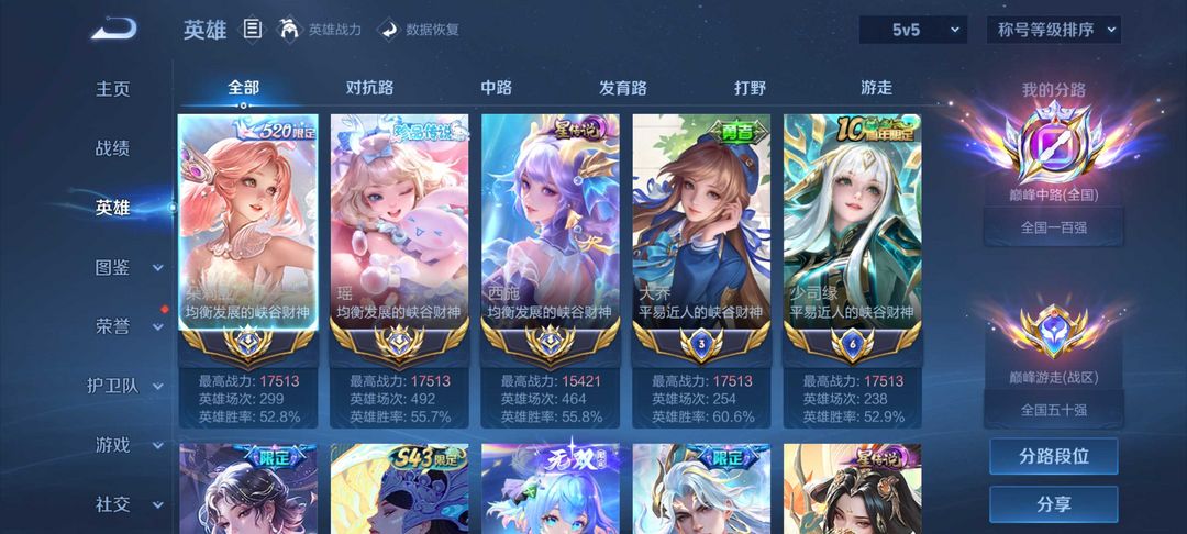 荣耀v10❤️历史7国服瑶朵莉亚西施巅峰百强中路游走❤️8小兵25星元37天幕满按键❤️图鉴343级