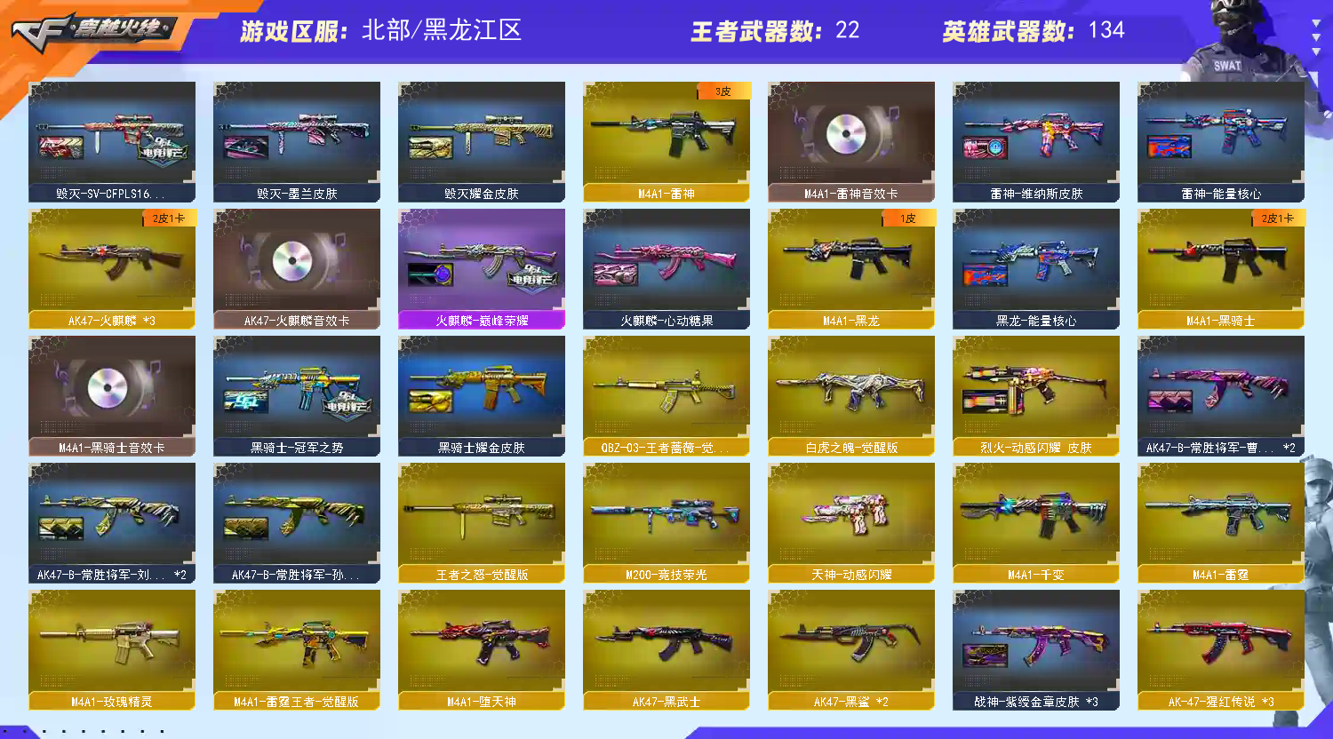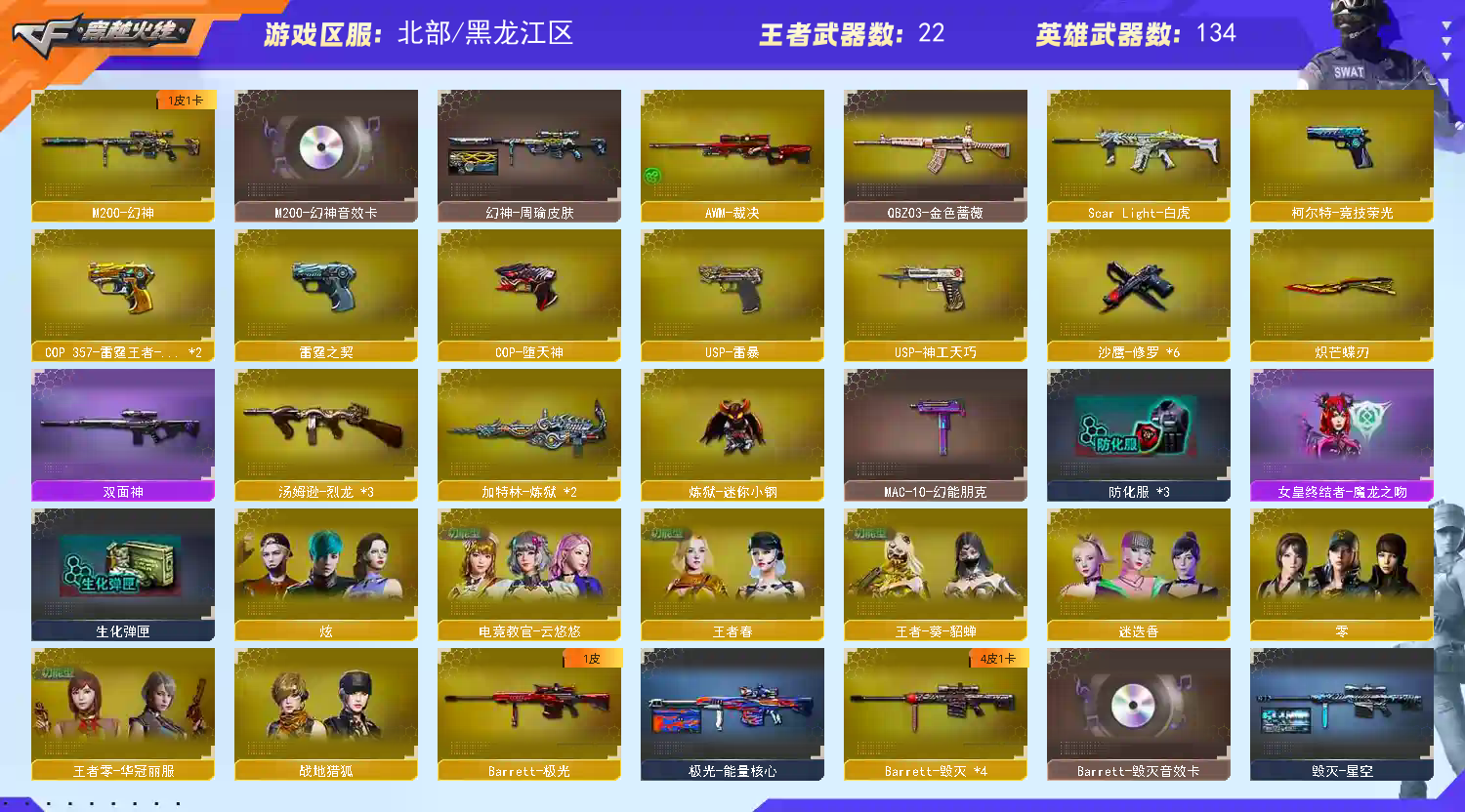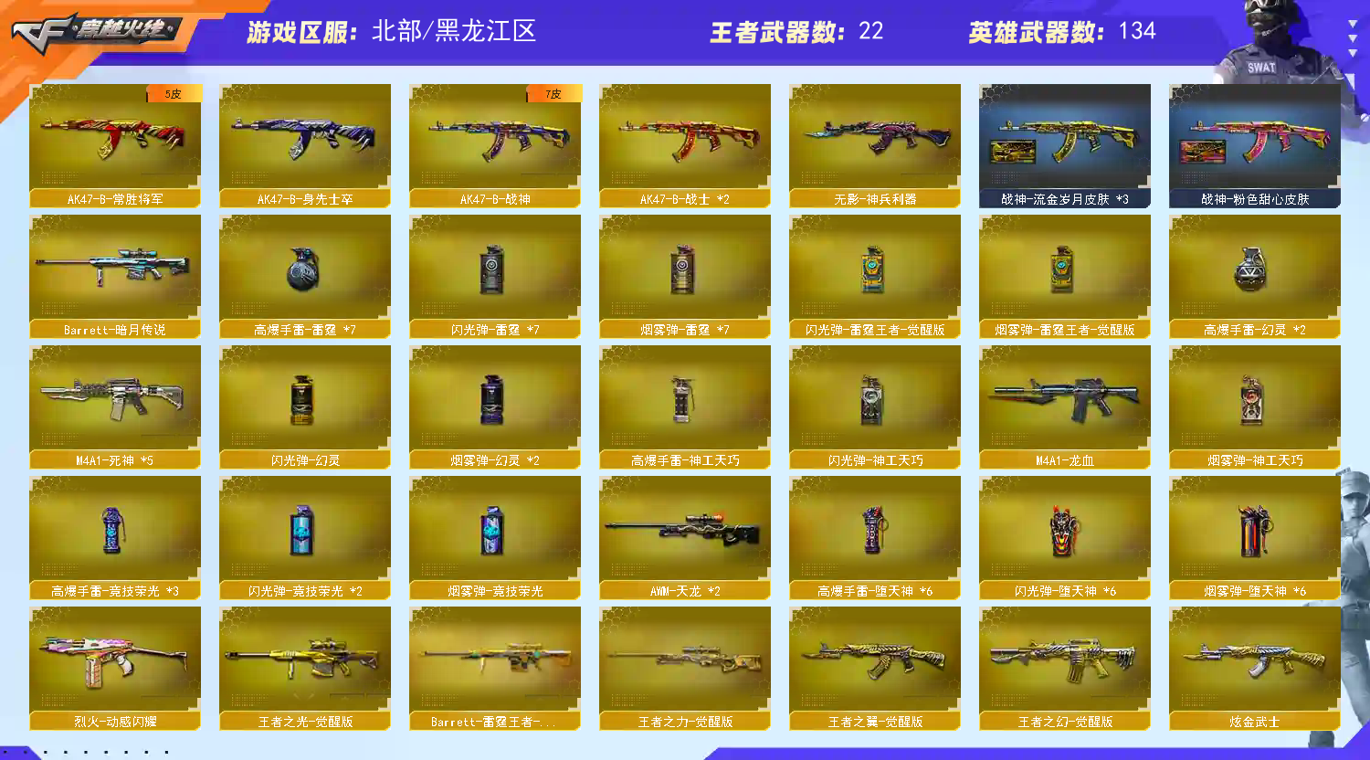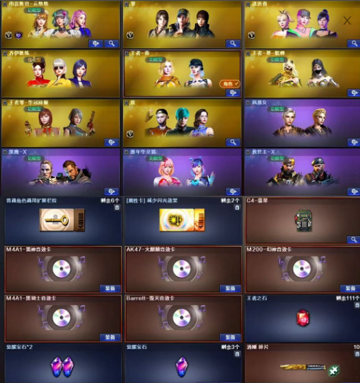 【王者武器】:【炫金武士-1,炫金雷神-1,高爆手雷-雷霆王者-1,Barrett-雷霆王者-觉醒版-1,COP 357-雷霆王者-觉醒版-2,M4A1-雷霆王者-觉醒版-1,QBZ-03-王者蔷薇-觉醒版-1,烟雾弹-雷霆王者-觉醒版-1,王者之光-觉醒版-1,王者之击-觉醒版-1,王者之力-觉醒版-1,王者之啸-觉醒版-2,王者之幻-觉醒版-1,王者之怒-觉醒版-1,王者之翼-觉醒版-1,闪光弹-雷霆王者-觉醒版-1,雷霆王者之锋-觉醒版-1】 【英雄武器】:【M4A1-死神-5,M4A1-千变-1,M4A1-黑骑士-1,M4A1-玫瑰精灵-1,AK47-黑武士-1,屠龙-3,龙啸-2,麒麟刺-4,AK47-火麒麟-3,AWM-天龙-2,Barrett-毁灭-4,汤姆逊-烈龙-3,Barrett-极光-1,沙鹰-修罗-6,加特林-炼狱-2,M4A1-雷神-1,M4A1-黑龙-1,9A91-烈火-2,M200-幻神-1,M4A1-雷霆-1,USP-雷暴-1,烟雾弹-雷霆-7,雷霆之怒-1,闪光弹-雷霆-7,M200-竞技荣光-1,幻灵之锋-1,擎天-竞技荣光-1,柯尔特-竞技荣光-1,烟雾弹-竞技荣光-1,闪光弹-竞技荣光-2,高爆手雷-竞技荣光-3,Scar Light-白虎-1,USP-神工天巧-1,炽芒蝶刃-1,高爆手雷-神工天巧-1,闪光弹-神工天巧-1,高爆手雷-雷霆-7,AK-47-猩红传说-3,无影-神兵利器-1,烟雾弹-神工天巧-1,Barrett-暗月传说-1,QBZ03-金色蔷薇-1,修罗-年鹏-1,M4A1-十二生肖·龙-雷神-1,烈火-动感闪耀-1,手雷-动感闪耀-1,天神-动感闪耀-1,屠龙-动感闪耀-1,擎天-1,M4A1-堕天神-1,COP-堕天神-1,AWM-裁决-1,高爆手雷-堕天神-6,龙啸-堕天神-1,麒麟刺-堕天神-2,闪光弹-堕天神-6,烟雾弹-堕天神-6,AK47-B-常胜将军-1,AK47-B-身先士卒-1,烟雾弹-幻灵-2,闪光弹-幻灵-1,雷霆之契-1,雷霆之锋-1,高爆手雷-幻灵-2,AK47-B-战神-1,AK47-黑鲨-2,AK47-B-战士-2,M4A1-龙血-1】 【装饰品】:【雷神-能量核心-1,黑龙-能量核心-1,极光-能量核心-1,暴躁猪猪玩偶-1,哪吒玩偶-1,妖姬玩偶-1,火麒麟-巅峰荣耀-1,火麒麟-心动糖果-1,黑骑士耀金皮肤-1,毁灭-星空-1,关羽玩偶-1,黑骑士-冠军之势-1,战神-粉色甜心皮肤-1,战神-流金岁月皮肤-1,战神-紫绶金章皮肤-1,AK47-B-常胜将军-孙权-1,毁灭耀金皮肤-1,幻神-周瑜皮肤-1,麒麟刺-萌杀皮肤-1,雷神-维纳斯皮肤-1,绝迹语音包-1,毁灭-SV-CFPLS16冠军-1】 【角色】:【金戈,陈龙野-X,零,堕天使,复仇者,幻影,飞虎队,猎狐者,刀锋,夜玫瑰,活力灵狐,嘉年华灵狐,木兰,雪莉杨-摸金校尉,炫,零-水下丽影,电竞教官-云悠悠,王者零-华冠丽服,救世主-X,风暴女,烈锋,新娜塔莎,潜龙队-X,麻雀,王者-葵-貂蝉,维纳斯,迷迭香,青霞仙子,职业选手,蜀雪,幽】 【道具】:【炫彩背包-1,金蛇戒-1,银蛇戒-1,烟雾保护头盔-1,防弹衣-1,手雷包-1,防化服-1,夺命之镰-1,变异宝贝-1,灵魂忍者-1,疯狂宝贝-1,迷雾幽灵-1,生化弹匣-1,步枪弹匣-1,Barrett-毁灭音效卡-1,M4A1-雷神音效卡-1,AK47-火麒麟音效卡-1,M4A1-黑骑士音效卡-1,M200-幻神音效卡-1,天使之翼-1,绿色巨人-1,兔子发带-1,大圣头盔-1】 【幻神武器】:【M200-幻神-1】;USP-雷暴,炽芒蝶刃,电竞教官-云悠悠,QBZ03-金色蔷薇,M200-幻神,Scar Light-白虎,