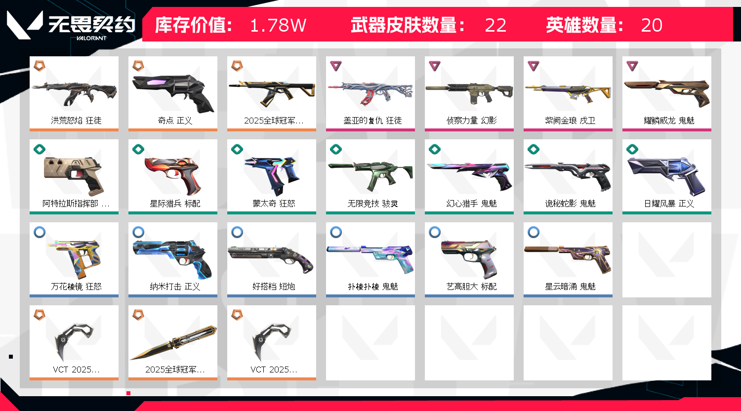 允许 英雄28 武器皮肤数量21;VCT 2025 爪刀,盖亚的复仇 狂徒,洪荒怒焰 狂徒,侦察力量 幻影,奇点 正义,