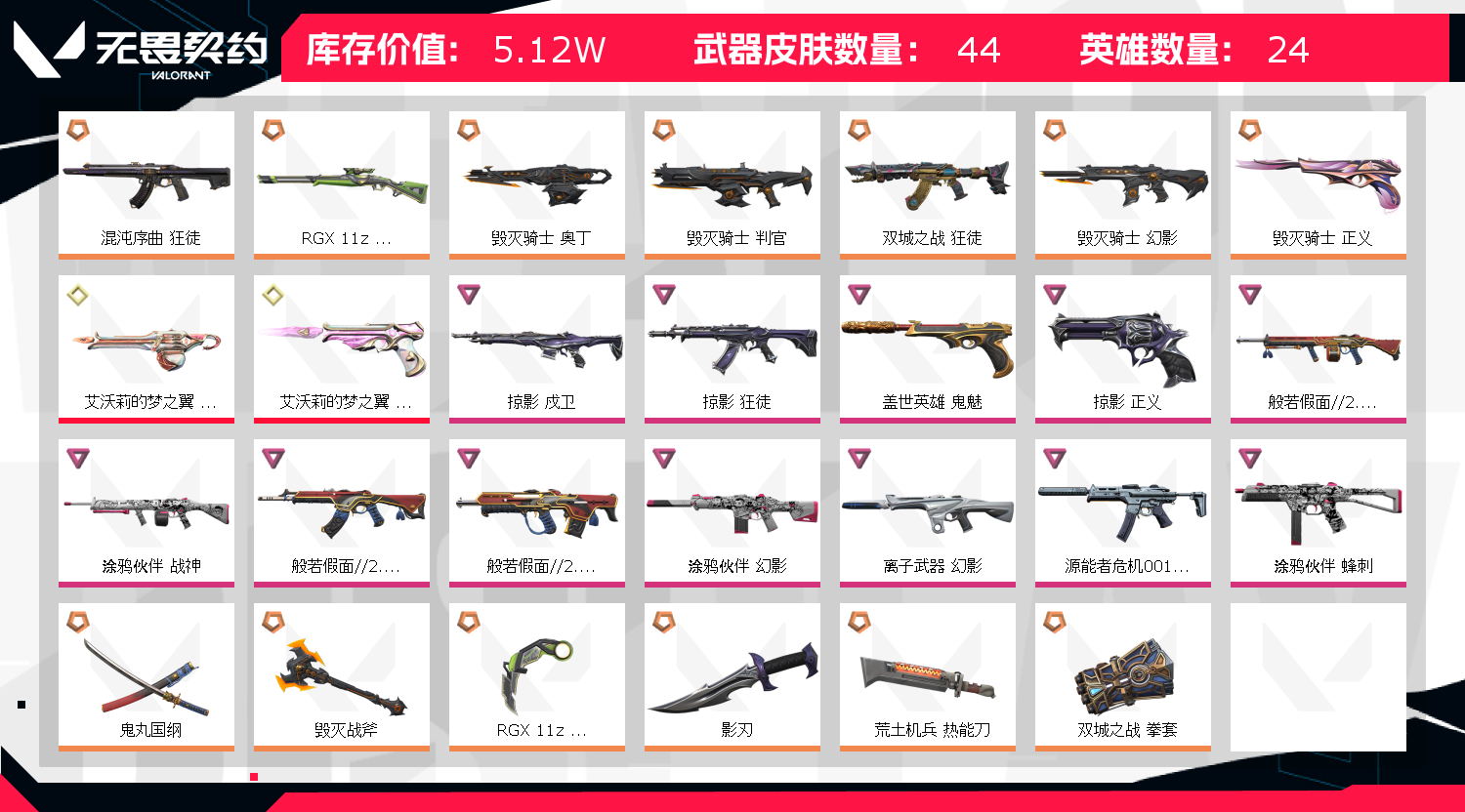 【拥有套装】双城之战套装(双城之战-狂徒,双城之战-拳套)毁灭骑士套装(毁灭骑士-幻影,毁灭骑士-奥丁,毁灭骑士-判官,毁灭骑士-正义,毁灭战斧)般若假面2.0套装(般若假面//2.0-狂徒,般若假面//2.0-獠犬,般若假面//2.0-战神,般若假面//2.0-狂怒,鬼丸国纲)掠影套装(掠影-狂徒,掠影-冥驹,掠影-戍卫,掠影-正义,影刃)涂鸦伙伴套装(涂鸦伙伴-幻影,涂鸦伙伴-战神,涂鸦伙伴-飞将,涂鸦伙伴-蜂刺,涂鸦伙伴-短炮)
