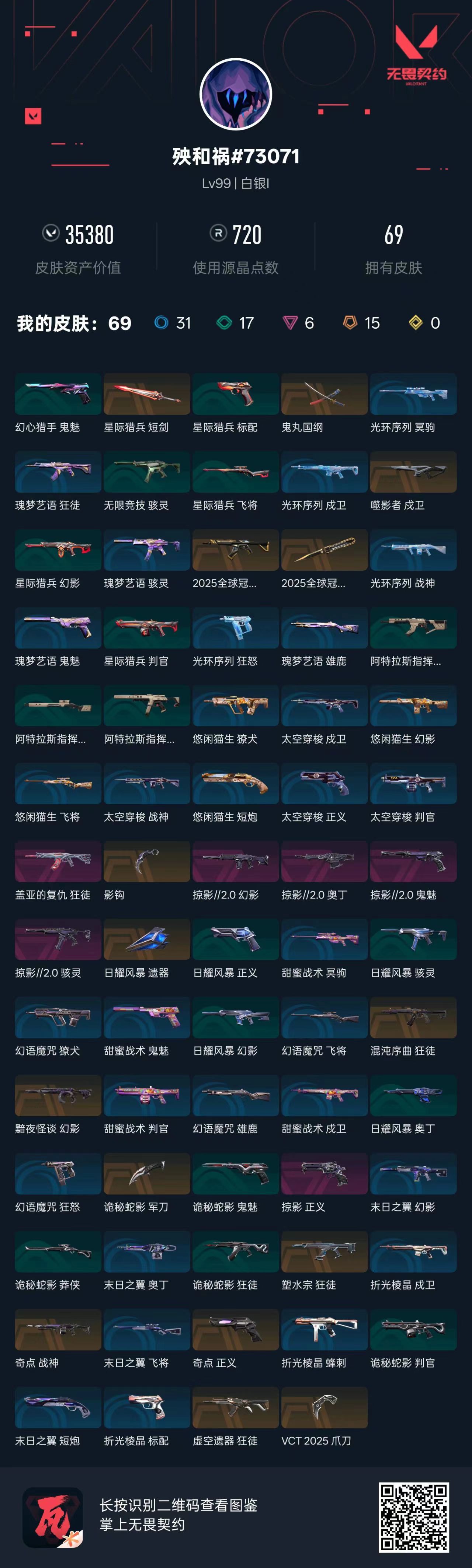 郑重声明: !!!!!因无畏契约检测严格,为防止后台插件导致封号,请务必重启电脑!!!!本人商户多年,所属账号已在派出所备案,若出现 账号封禁/毁号等情况,会马上与平台联系,平台会报警处理!请租客文明游戏,不要开挂或挂机! 1.登陆界面稍等2分钟会上去(自动登录)老板不要着急,一次不行多来几次wegame界面要耐心等2分钟 2.密令会自动输入如果一次不成功多来几次 3..进入wegame后到弹短信验证处,关闭掉,重新下载无畏契约这个游戏即可成功上号,记住。这个方法百分百上号成功!就是进入wegame重新下载无畏契约游戏 !!!百分百成功!! 4.请及时续租不要挂机,到时不下线,但是下一个会挤号导致挂机,所以请及时续租,导致禁赛的一律拉黑 5.祝老板玩的愉快,喜欢可以收藏关注 ! 开挂必追究,不拿到赔偿不罢休! 如果上号正在游戏中,是上个租客到时不下线导致的,不是号主在玩,请帮忙打完这局, 谢谢了,为了防止顶号,请您及时续租获得更好的游戏体验;奇点 战神,VCT 2025 爪刀,盖亚的复仇 狂徒,虚空遗器 狂徒,混沌序曲 狂徒,塑水宗 狂徒,奇点 正义,
