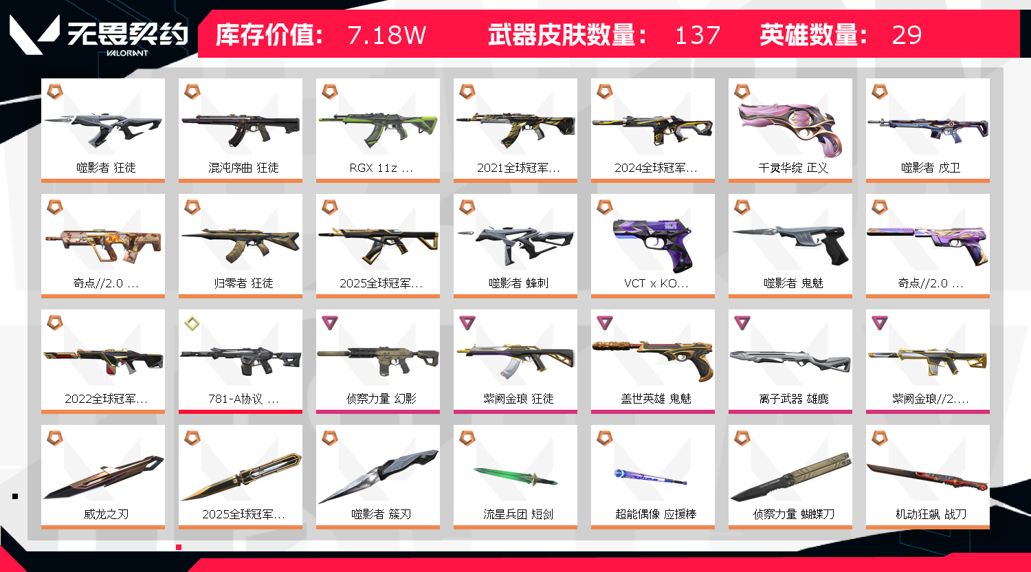 7.2w库存⚡️21冠军⚡️24冠军⚡️25冠军⚡️22冠军;威龙之刃,噬影者 狂徒,侦察力量 幻影,紫阙金琅 狂徒,RGX 11z Pro 狂徒,混沌序曲 狂徒,2021全球冠军赛 狂徒,