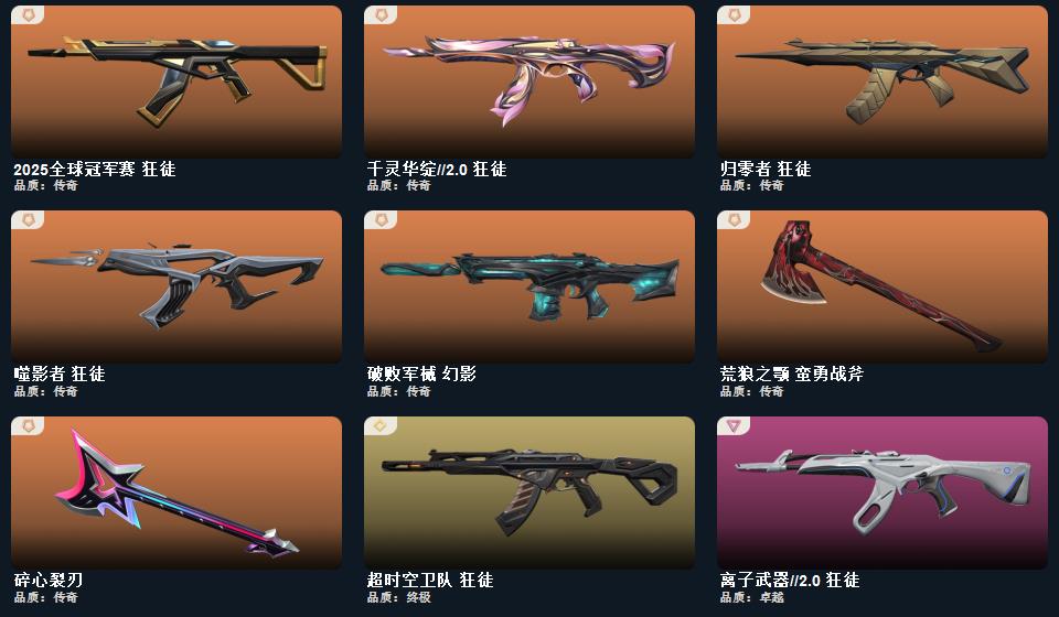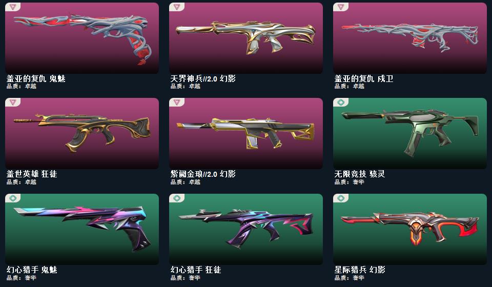 wegame无畏契约★碎心裂刃,荒狼之颚 蛮勇战斧,盖亚的复仇 鬼魅,甜心猎手 蜂刺,星际猎兵 判官,盖亚的复仇 戍卫,诛心猎手 冥驹,诛心猎手 奥丁