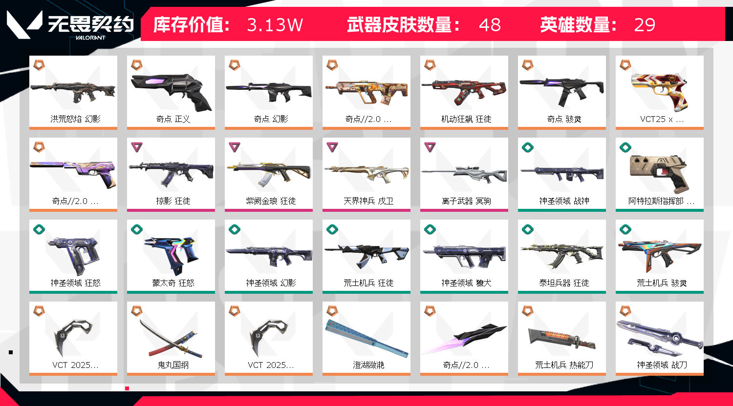 【套装】:VCT 2025 赛季套装,奇点//2.0套装,回火礼包:奇点套装 【英雄】:幻棱,炼狱,维斯,暮蝶,钛狐,壹决,铁臂,捷风,雷兹,幽影,不死鸟,贤者,猎枭,蝰蛇,零,芮娜,奇乐,尚勃勒,霓虹,斯凯,夜露,星礈,K/O,海神,盖可,黑梦,钢锁 【近战武器】:近战武器-奇点//2.0 蝴蝶刀,近战武器-VCT 2025 爪刀,近战武器-澄湖滟,近战武器-鬼丸国纲,近战武器-荒土机兵 热能刀,近战武器-神圣领域 战刀 【狂徒】:狂徒-机动狂飙,狂徒-奇点//2.0,狂徒-掠影,狂徒-紫阙金琅,狂徒-荒土机兵,狂徒-泰坦兵器 【幻影】:幻影-洪荒怒焰,幻影-奇点,幻影-神圣领域,幻影-纳米击 【戍卫】:戍卫-天界神兵,戍卫-逆冲蛮牛,戍卫-月球哨兵 【獠犬】:獠犬-神圣领域,獠犬-逆冲蛮牛 【冥驹】:冥驹-离子武器,冥驹-荒土机兵,冥驹-星云暗涌 【莽侠】:莽侠-月球哨兵 【战神】:战神-神圣领域 【奥丁】:奥丁-纳米击 【判官】:判官-纳米击x 【雄鹿】:雄鹿-逆冲蛮牛,雄鹿-月球哨兵 【骇灵】:骇灵-奇点,骇灵-荒土机兵,骇灵-星云暗涌 【蜂刺】:蜂刺-星云暗涌 【标配】:标配-荒土机兵 【VCT手枪】:标配-VCT25 x EDG 【正义】:正义-奇点,正义-超限闪存,正义-复古浪潮,正义-纳米击,正义-月球哨兵 【鬼魅】:鬼魅-奇点//2.0,鬼魅-数码咒术,鬼魅-星云暗涌 【狂怒】:狂怒-神圣领域,狂怒-逆冲蛮牛 【卡面】:终章:激斗汉堡 卡面,进入射程 卡面,分崩离析 卡面,纳米击 卡面,抑制技术 卡面,激斗汉堡 卡面,瓦娃雪糕 P2 卡面,从黄昏到黎明 卡面,荒土机兵 卡面,银弹猎手 卡面,逆冲蛮牛 卡面,《双城之战》拥抱 卡面,精灵大战 卡面,欢迎来到底城 卡面,南瓜盛典 卡面,奇点//2.0 卡面,修车达人 卡面,正义的化身 卡面,红鳞松叶 卡面,源能反应 卡面,零点嗅探设计图 卡面,终章:瓦娃雪糕 卡面,表象之下 卡面,沙雕爆能器 卡面,无畏契约GO!一卷:芮娜 卡面,清除名单 卡面,无畏契约GO!一卷:零 卡面,龍记 卡面,无垠星环 卡面,完美调谐 卡面 ,暗枪 卡面,无畏契约GO!一卷:贤者 卡面,铁臂设计图 卡面,代号红色 卡面,冰淇淋店 卡面,新兵报到 卡面,V契约 卡面,无畏契约 卡面 【喷漆】:小小心意 喷漆,战“素”兔 喷漆,宇宙的指引 喷漆,请求重启 喷漆,逆冲蛮牛 喷漆,纳米击 喷漆,鼻尖上的蝴蝶 喷漆,简笔画黯兽 喷漆,独守蝰腹 喷漆,他们将落荒而逃 喷漆,通缉:战术鹅 喷漆,荒土机兵 喷漆,别挡我吃球! 喷漆,嗨宝南瓜灯 喷漆,嘭! 喷漆,都算到了 喷漆,控场勿近 喷漆,小丑猫 喷漆,奇点//2.0 喷漆,熊抱 喷漆,我的刀呢? 喷漆,UWU 喷漆,新潮流 喷漆,双击点赞 喷漆,买装还是存钱 喷漆,醒狮贺春 喷漆,关门放狗 喷漆,蕊形灯 喷漆,胜利属于无畏契约 喷漆,GLHF 喷漆,无畏契约 喷漆 【挂饰】:终章:猫猫木乃伊 挂饰,荒土机兵 挂饰,悠闲鸡块 挂饰,猫猫木乃伊 挂饰,水壶 挂饰,纳米击 挂饰,逆冲蛮牛 挂饰,可爱糖糖 挂饰,伞绳 挂饰,《双城之战》小蛋糕 挂饰,第九季//第三幕 纪念币 挂饰,工具腰带 挂饰,无畏契约GO!一卷 芮娜 挂饰,无畏契约GO!一卷 零 挂饰,奇点//2.0 挂饰,熔岩灯 挂饰,第九季//第二幕 纪念币 挂饰,Z世代特饮 挂饰,动力机箱 挂饰,荧光棒 挂饰,VCT x EDG 挂饰,第八季//第三幕 纪念币 挂饰,终章:扭结饼干 挂饰 ,瓶中信 挂饰,传世莲华 挂饰,第八季//第二幕 纪念币 挂饰 ,天外飞客 挂饰,好运福爪 挂饰,《双城之战》魄罗 挂饰,瞄这里 挂饰,第八季//一幕 纪念币 挂饰,第七季//第三幕 纪念币 挂饰,幸运中国结 挂饰,第七季//第二幕 纪念币 挂饰,无畏契约 纪念币 挂饰;VCT 2025 爪刀,掠影 狂徒,洪荒怒焰 幻影,紫阙金琅 狂徒,天界神兵 戍卫,离子武器 冥驹,奇点 正义,