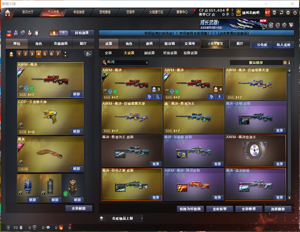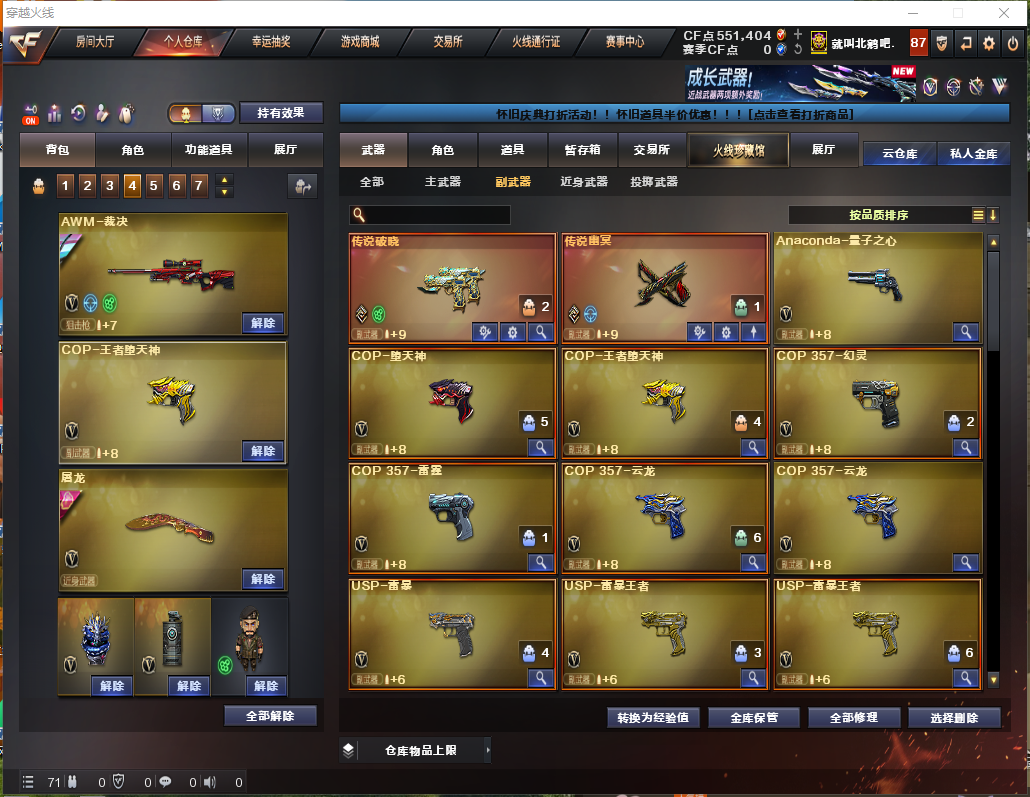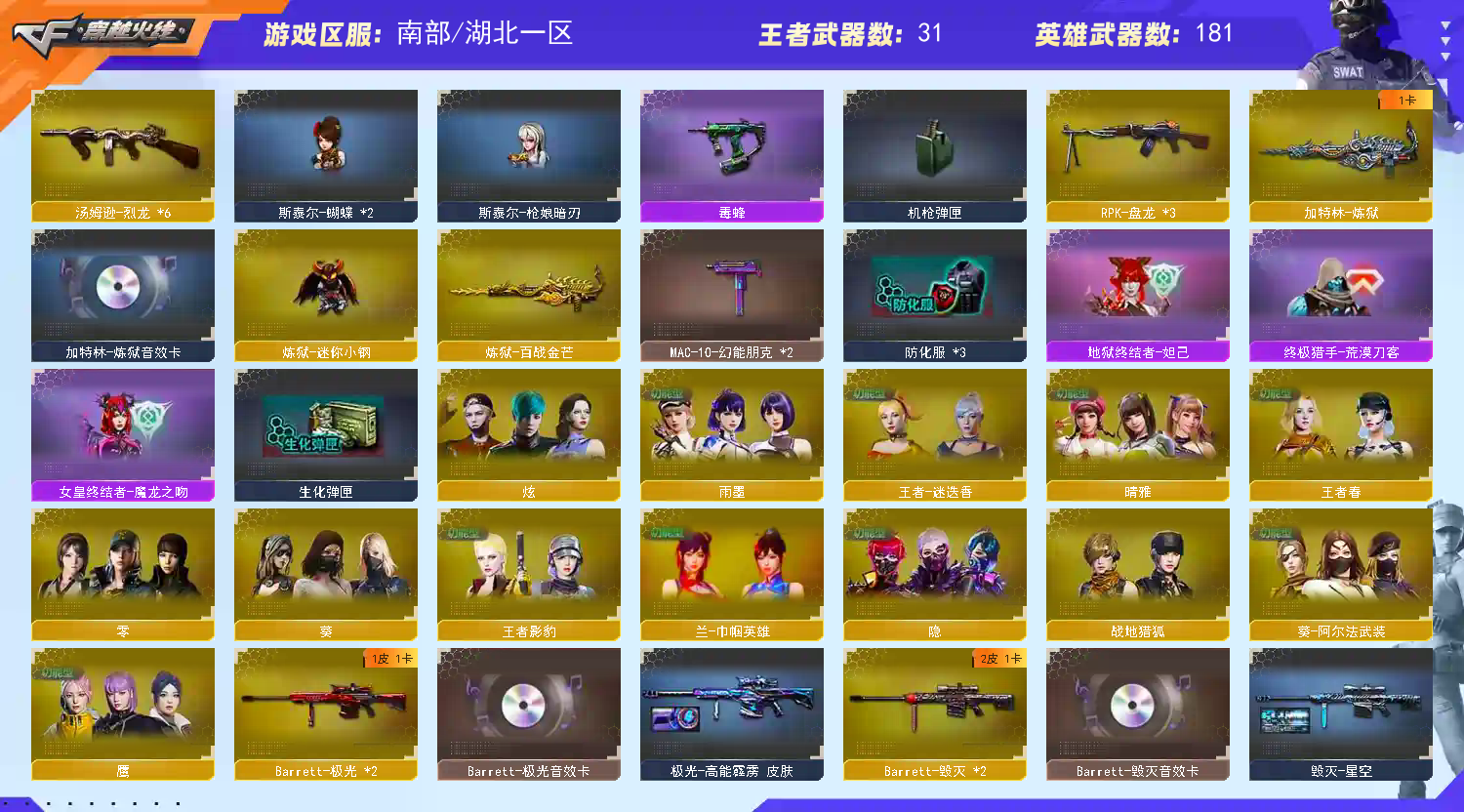 幻神三件⑩皮/星神三件⑤皮/裁决三件⑥皮/蔷薇④皮蝴蝶刀②皮②传说灵眸破晓幽冥/八面玲珑三件手枪满配