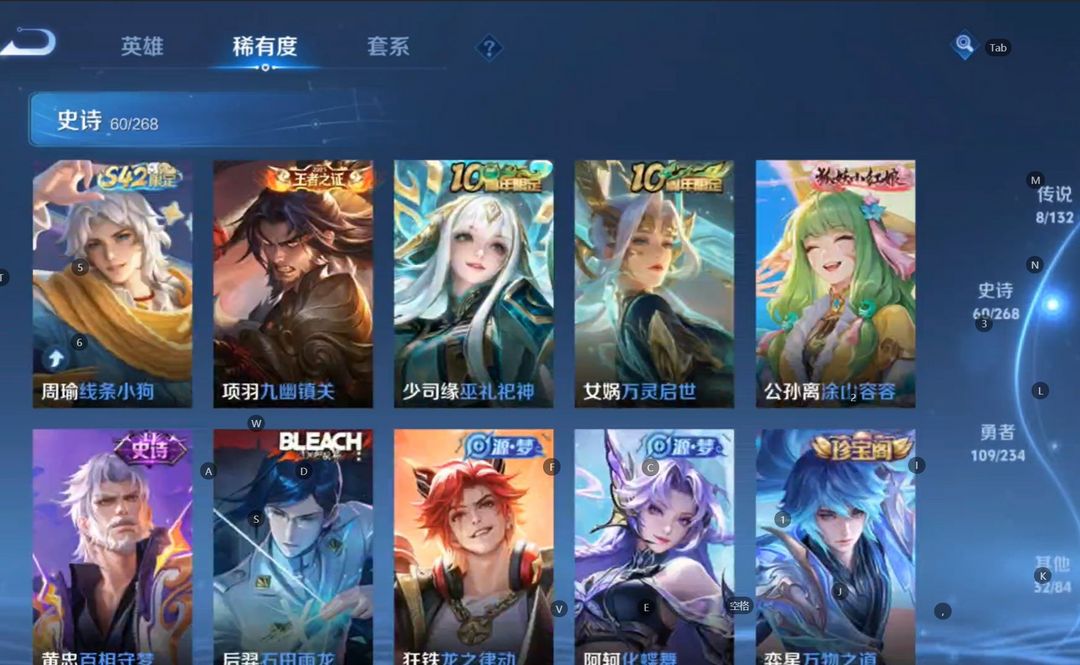 v10、12水562皮、死亡执政官、刘备星传说时之思念、小兵皮肤大耳狗甜茶、瑶无双真我赫兹、愿照·九州拓、怪盗基德、画中仙、至尊宝、凤求凰、神威、天魔缭乱