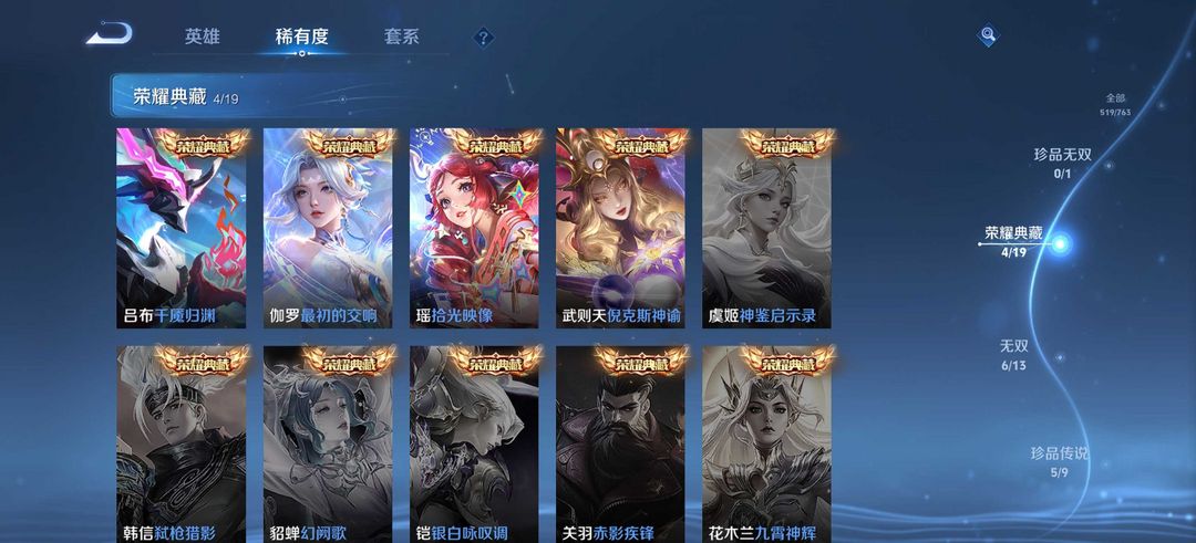 v10、537皮6水4无双、安琪拉-颠倒童话·魔镜、朵莉亚-神骥、遇见神鼓、齐天大圣、白虎志、韩信荣耀典藏、73传说、时之魔女、瑶无双、青丘、九尾、神器明辉仪