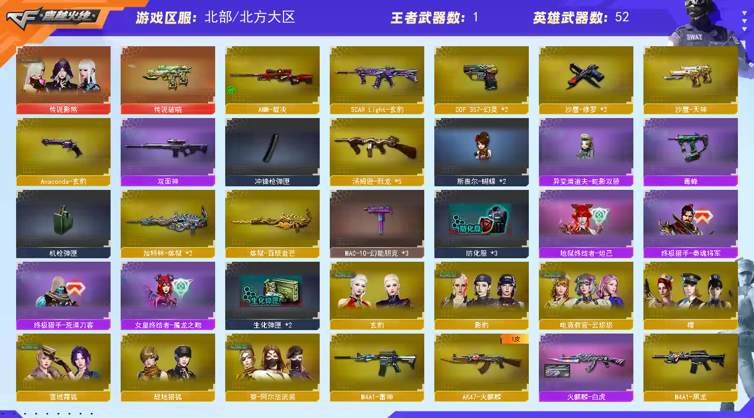 【主武器】M200-竞技荣光/②斯太尔蝴蝶/异变清道夫蛇影双骄/⑥烈龙/SCARLight玄豹/②M4幻灵/雷神/黑武士/超新星热带奇洋/死神雪域霜狐/机械迷城穹宇/炼狱百战金芒/雷神小红/火麒麟纪元/双面神/机甲撕裂者3/金魔/神圣爆裂者3/生存之眼/猩红司令玩偶M37/死亡之眼庆典CFS2021/EVO赤血龙魂 【副武器}】传说破晓/玄豹左轮/②COP幻灵/修罗古蛇迷踪/天神/5涂鸦手枪 【近身武器】炽芒蝶刃/丛林匕首玄豹/2幻灵之峰/擎天竞技荣光/擎天云海游龙/龙啸热带奇洋/麒麟刺百战金芒/黄金尼泊尔/黄金生化钩/迷你深渊冰龙博士裂空之翼白虎/手斧镜 【投掷武器】④迷你生化手雷/②高爆幻灵+②烟闪/手雷热带奇洋/手雷云海游龙 【角色】传说影煞+四防/电竞教官云悠悠+四防/影豹+四防/零纪元/战地猎狐/阿尔法武装/奇洋探员/乔伊教练/蛇隐宗/修道士/雪域霜狐/云海游龙/空/葵赛博朋克/兰海滩派对/零热舞青春/零水下丽影/幽/对讲机/炫彩背包/圣灵戒/魔龙戒 【皮肤】火麒麟白虎皮肤/修罗star皮肤 【音效卡】炼狱百战金芒音效卡/麒麟刺百战金芒音效卡/死神雪域霜狐音效卡 【道具】紫金大元首/全背包/VIP6/AC/烟雾头/手枪/冲锋枪/机枪/生化弹夹/变异宝贝/疯狂宝贝/妖姬/灵魂忍者/绿巨人/迷雾幽灵/终极猎手荒漠刀客+秦魂将军皮肤/时空猎手幻影猎人皮肤/钢铁终结者湮灭之柱/地狱终结者妲己皮肤/虚空终结者皮肤/机械猎手幻灵猎姬皮肤/女皇终结者皮肤/生化爆破全装 温馨提示】此号价值数二十万,如有开G开辅助封号的,想想自己是否能够承担的起后果自负,由平台提供,身份信息,证据和地址进行报警处理!祝各位老板玩得开心。请使用官方启动,更快捷稳定上号。偶尔会异地冻结,显示暂时无法登陆,请维权更新密码,商品完成维权代表密码已更新,再次下单即可,带来不便,抱歉。恶意下单维权及检测到外挂将无法再次下单! 【游戏小贴士】官方启动高配置电脑分辨率调整144hz刷新率16:9比例1920*1080画面更清晰,设置好分辨率结束游戏重新打开游戏界面登录(不退游戏登录器)无黑屏,关闭击中效果,开启饰品确认玫击,游戏体验更佳。 【请租客爱护此号,当成自己号玩,喜欢请收藏,感谢】;炽芒蝶刃,传说影煞,电竞教官-云悠悠,