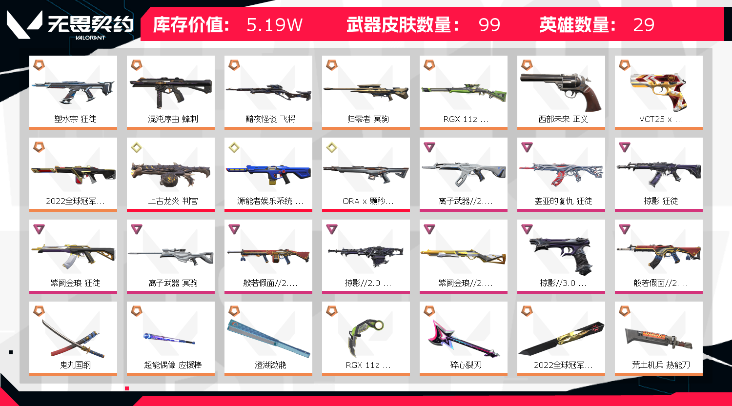 【拥有套装】2022全球冠军赛套装(2022全球冠军赛-幻影,2022全球冠军赛-蝴蝶刀)般若假面2.0套装(般若假面//2.0-狂徒,般若假面//2.0-獠犬,般若假面//2.0-战神,般若假面//2.0-狂怒,鬼丸国纲) 【拥有近战武器】超时空卫队-三棱军刺,RGX-11z-Pro//3.0-爪刀, 【拥有步枪】塑水宗-狂徒,ORA-x-颗秒-幻影,源能者娱乐系统-幻影,离子武器//2.0-狂徒,紫阙金琅-狂徒,盖亚的复仇-狂徒,掠影-狂徒 【拥有狙击枪】黯夜怪谈-飞将,RGX-11z-Pro//3.0-莽侠,归零者-冥驹,离子武器-冥驹 【拥有机枪】掠影//2.0-奥丁 【拥有冲锋枪】混沌序曲-蜂刺 【拥有霰弹枪】上古龙炎-判官,紫阙金琅//2.0-雄鹿 【拥有手枪】VCT25-x-EDG-标配,西部未来-正义,掠影//3.0-追猎,日冕雄师-正义 【稀有挂件】V25第六幕黄金挂饰,糖饼先生挂饰,V25第三幕白银挂饰,第九季铂金挂饰,终章猫猫木乃伊挂饰,猫猫木乃伊挂饰, 【卡面信息】糖饼惊喜卡面,分崩离析卡面,我眼中的世界卡面,双城之战拥抱卡面,超能偶像卡面,;上古龙炎 判官,盖亚的复仇 狂徒,掠影 狂徒,源能者娱乐系统 幻影,紫阙金琅 狂徒,塑水宗 狂徒,离子武器//2.0 狂徒,
