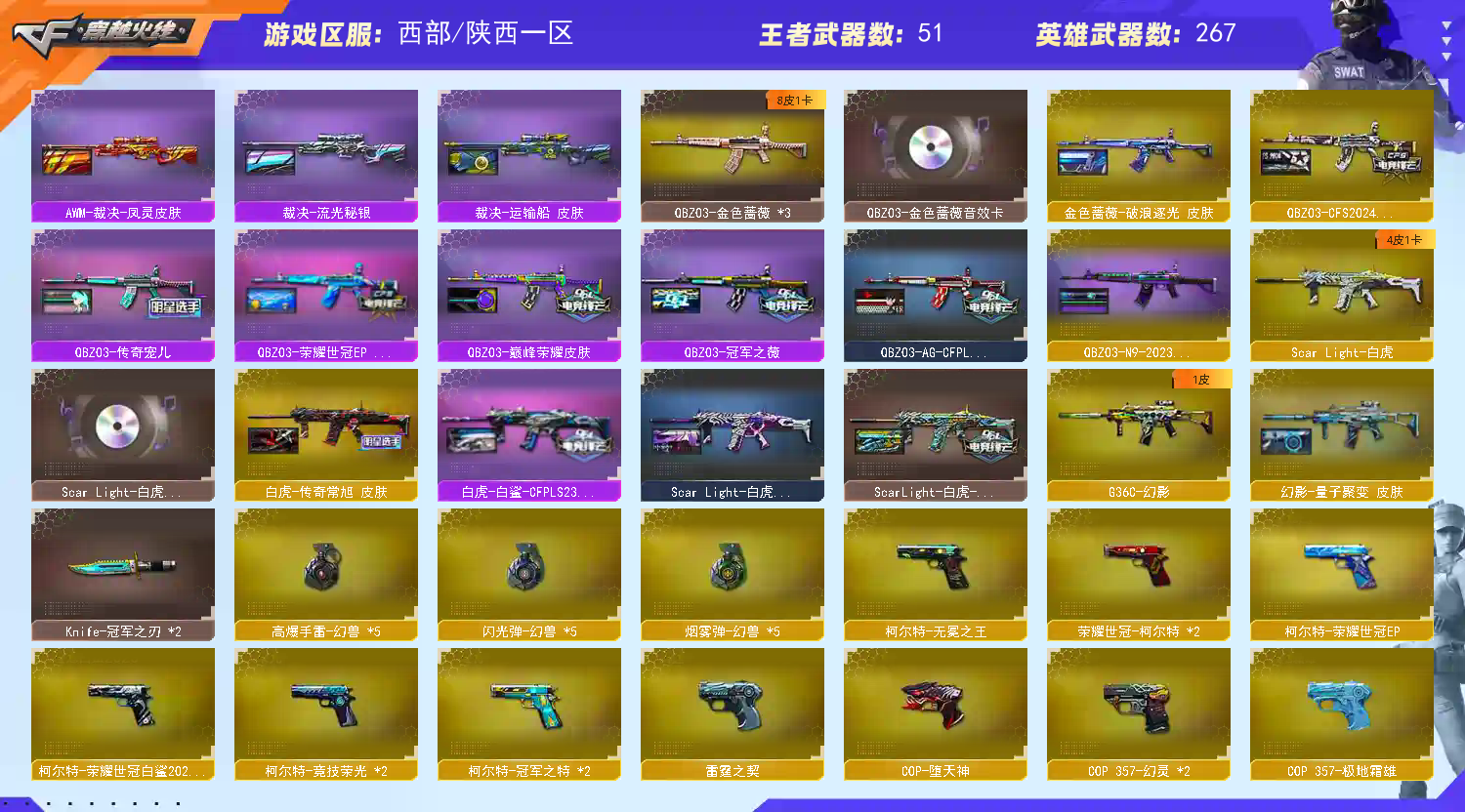 开挂十年直接起诉;USP-雷暴,柯尔特-无冕之王,荣耀世冠-柯尔特,柯尔特-荣耀世冠白鲨2023,柯尔特-冠军之特,炽芒蝶刃,Knife-冠军之刃,
