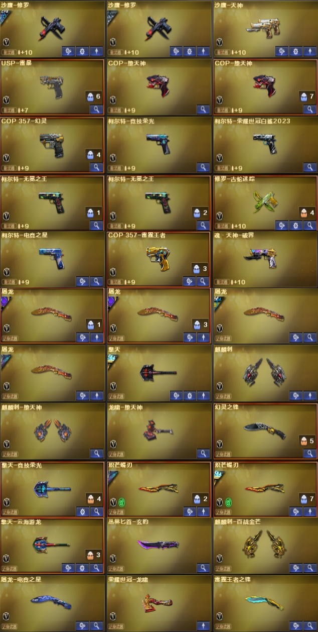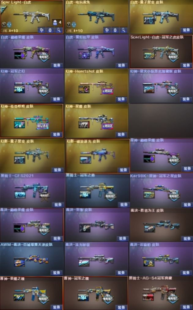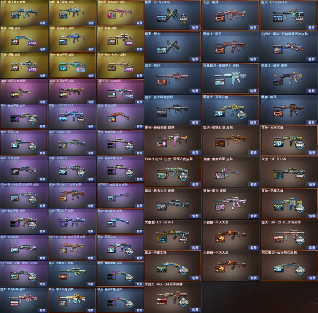 裁决三件套6皮,幻神三件套5皮,满配手枪,白虎4皮,星神三件,幻影2皮,2蝴蝶刀,八音效卡,禁止外挂