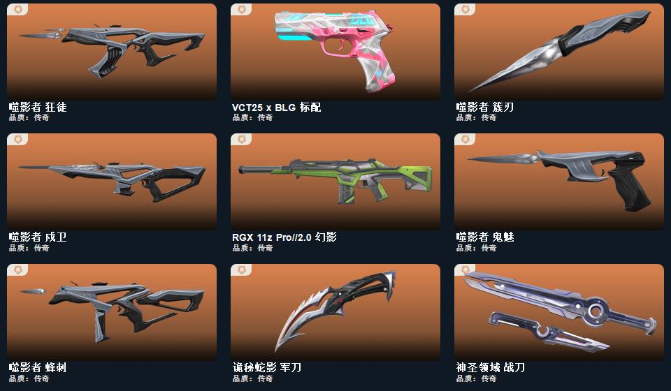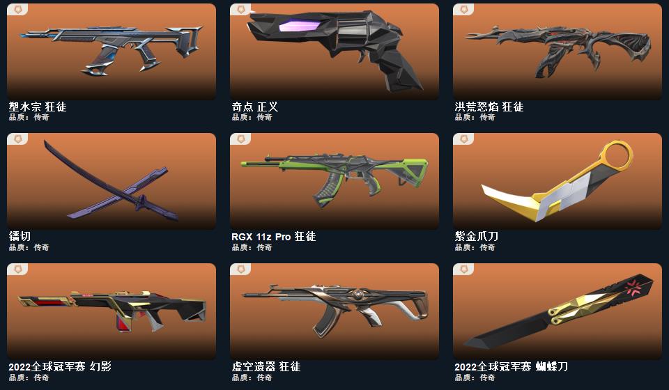 碎心裂刃,星际猎兵 短剑,2022全球冠军赛 蝴蝶刀,日耀风暴 遗器,紫金爪刀,诡秘蛇影 军刀,噬影者 簇刃,神圣领域