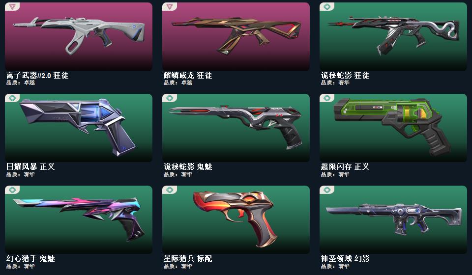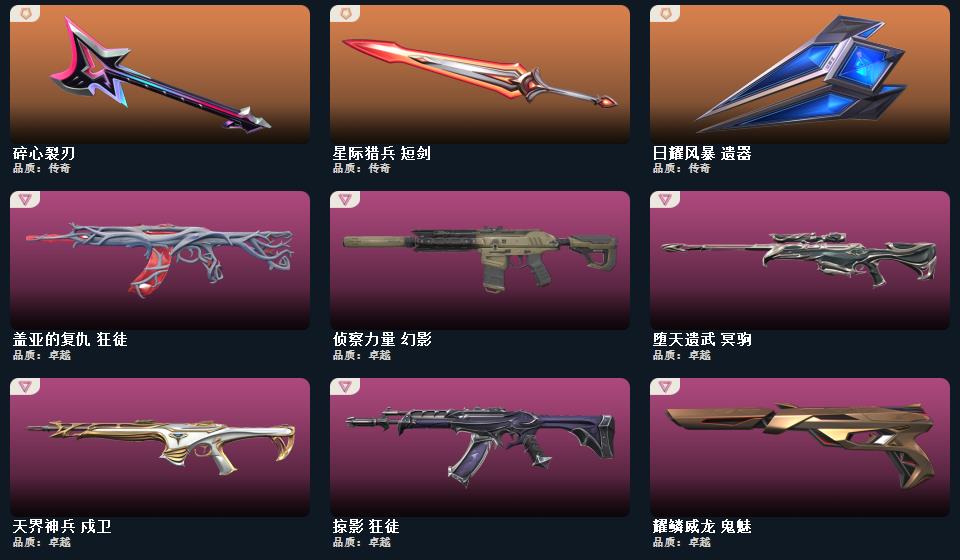 wegame无畏契约★武器皮肤数量:99,碎心裂刃,星际猎兵 短剑,2022全球冠军赛 蝴蝶刀,日耀风暴 遗器,紫金爪刀,诡秘蛇影 军刀,噬影者 簇刃,神圣领域 战刀,镭切,幻心猎手 鬼魅,甜心猎手 蜂刺,星际猎兵 判官,甜心猎手 幻影,诛心猎手 冥驹,诛心猎手 奥丁