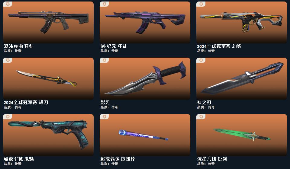 wegame无畏契约★神之刃,影刃,2024全球冠军赛 战刀,超能偶像 应援棒,流星兵团 短剑,幻心猎手 鬼魅,无限竞技 骇灵,超能偶像 判官,日冕雄师 狂徒,神中神罚 莽侠,