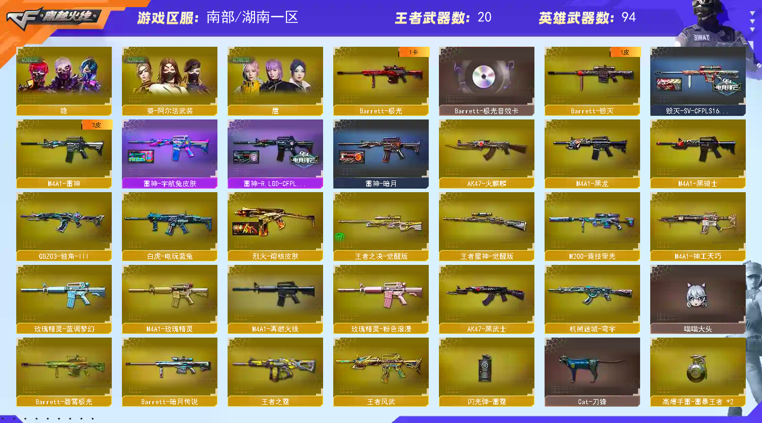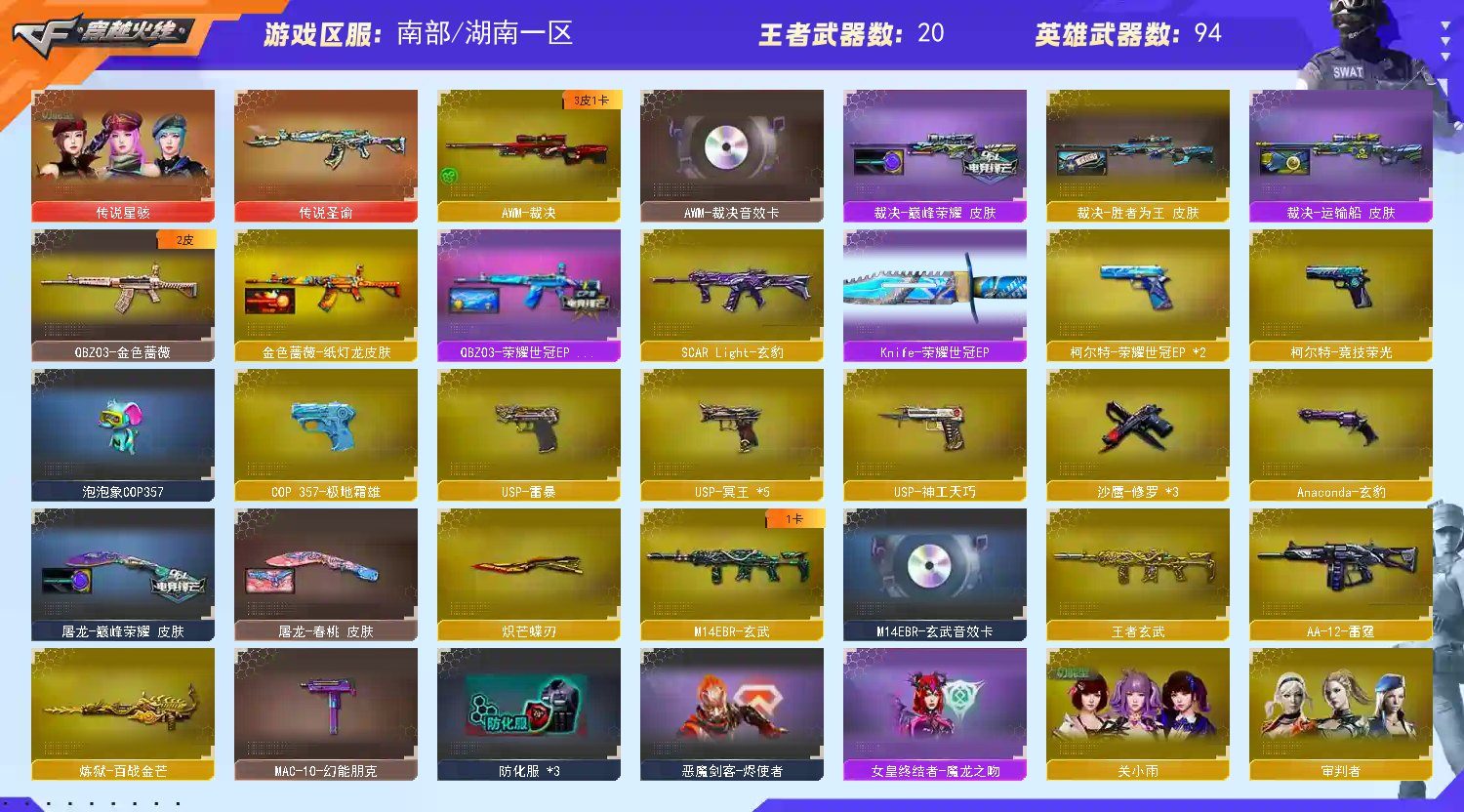 首页 > 租号大厅 > 穿越火线 > 电信区/湖南一区 > 【南.部】双全天花板♥星骇无幻神新ag+EP♥王者星神♥裁决三件套♥白虎qbz玄武12把高质量手枪