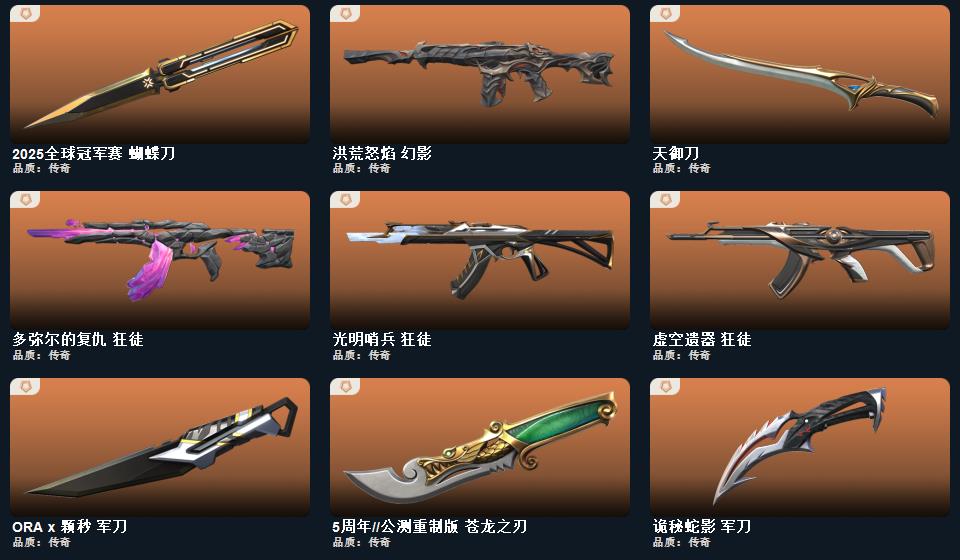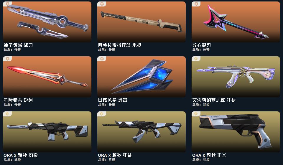 wegame无畏契约★ORA x 颗秒 军刀,碎心裂刃,天御刀,星际猎兵 短剑,2025全球冠军赛 蝴蝶刀,阿特拉斯指挥部 甩棍,日耀风暴 遗器,5周年//公测重制版 苍龙之刃,诡秘蛇影 军刀,ORA x 颗秒 正义,紫阙金琅 狂徒,ORA x 颗秒 冥驹