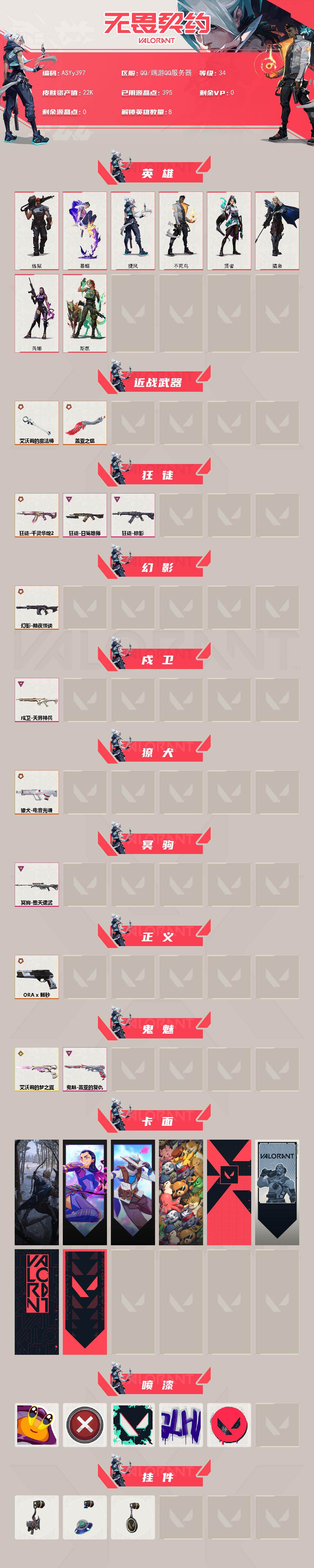 【英雄】:炼狱,暮蝶,捷风,不死鸟,贤者,猎枭,芮娜,斯凯 【近战武器】:近战武器-艾沃莉的魔法棒,近战武器-盖亚之愠 【狂徒】:狂徒-千灵华绽//2.0,狂徒-掠影,狂徒-日冕雄师 【幻影】:幻影-黯夜怪谈 【戍卫】:戍卫-天界神兵 【獠犬】:獠犬-电音光谱,獠犬-电音光谱 【冥驹】:冥驹-堕天遗武 【正义】:正义-ORA x 颗秒 【鬼魅】:鬼魅-艾沃莉的梦之翼,鬼魅-盖亚的复仇 【卡面】:钢弓与箭弦 卡面,无畏契约GO!一卷:芮娜 卡面,无畏契约GO!一卷:零 卡面,同步耍酷 卡面,代号红色 卡面,新兵报到 卡面,V契约 卡面,无畏契约 卡面 【喷漆】:珍珠棘贝 喷漆,买装还是存钱 喷漆,胜利属于无畏契约 喷漆,GLHF 喷漆,无畏契约 喷漆 【挂饰】:鱼骨头 挂饰,天外飞客 挂饰,无畏契约 纪念币 挂饰;掠影 狂徒,天界神兵 戍卫,堕天遗武 冥驹,