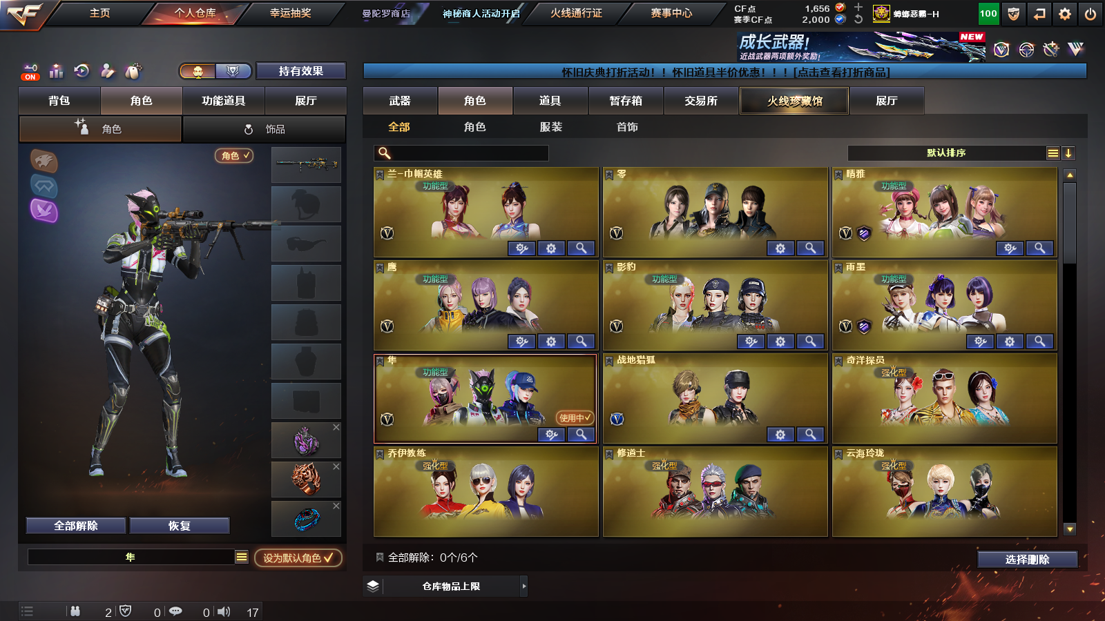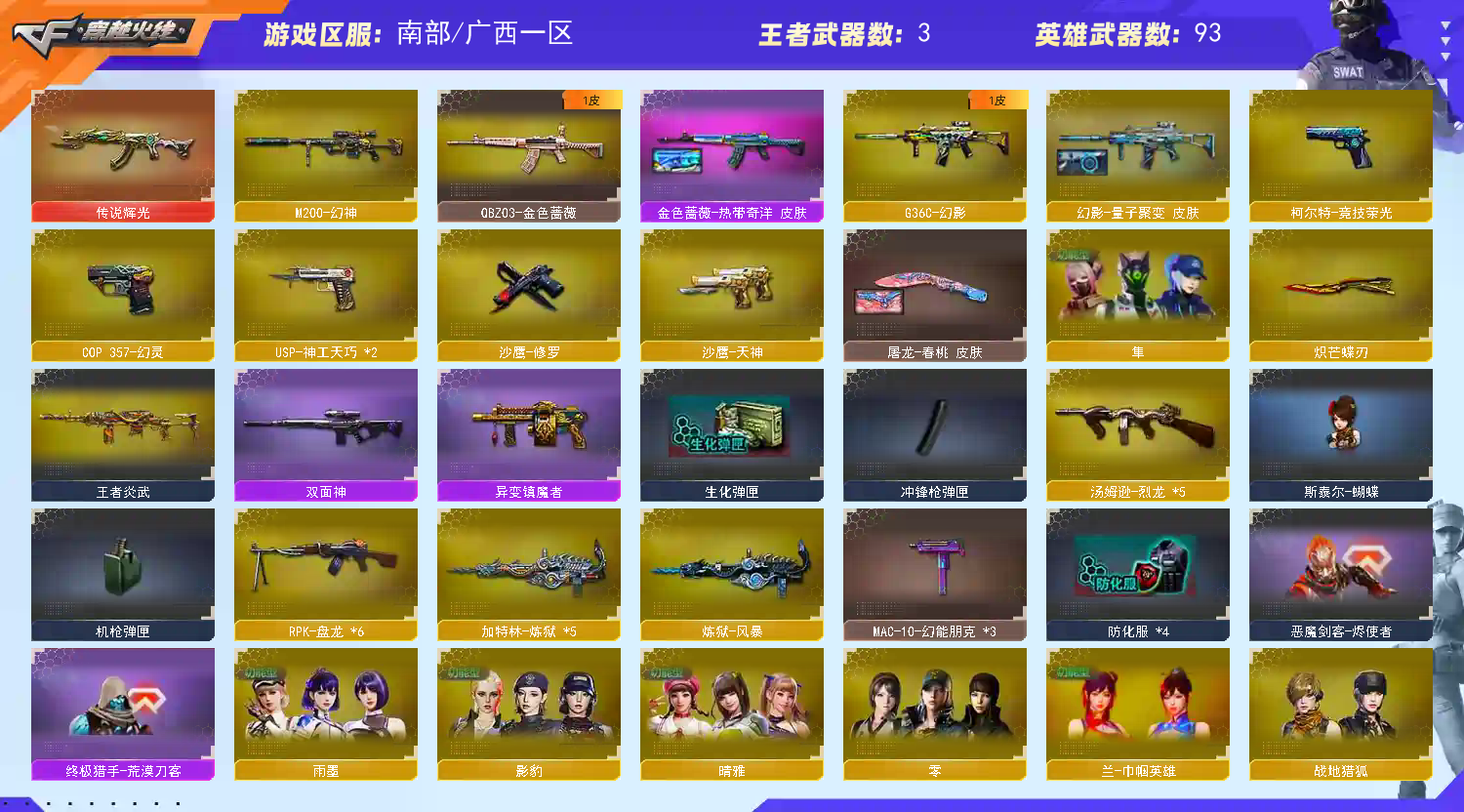首页 > 租号大厅 > 穿越火线 > 电信区/广西一区 > [官方严选]幻神/G36C/炽芒蝶刃/竞技套/白虎/98k/生化爆破四防角色➕蝴蝶六烈/六炼/隼