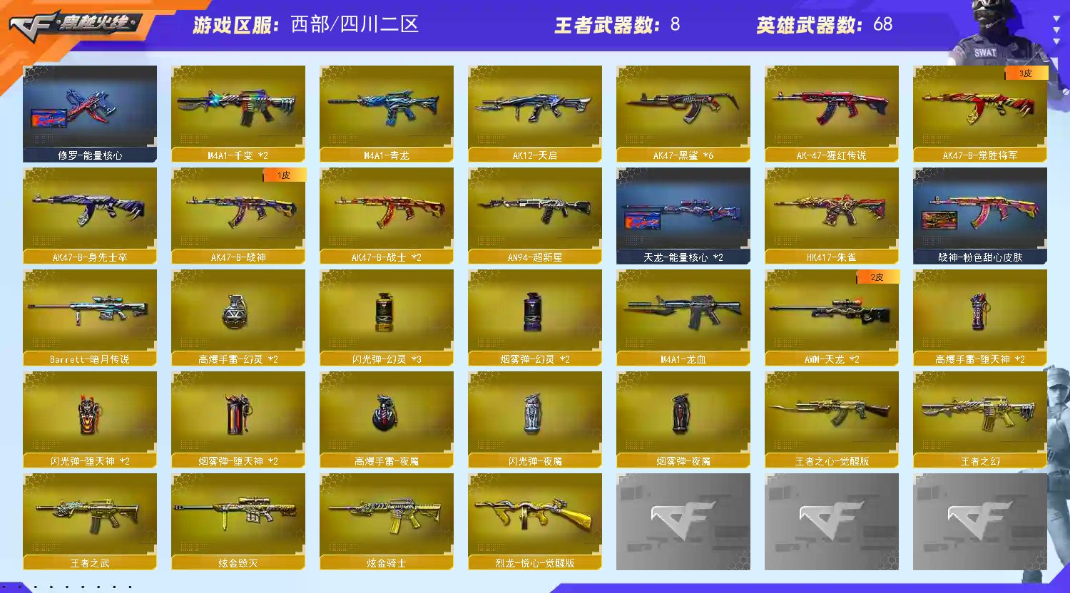 首页 > 租号大厅 > 穿越火线 > 电信区/四川二区 > 西部【scar白虎】【qbz金色蔷薇】【裁决 】【朱雀】【火麒麟】【黑龙】【雷神+卡】
